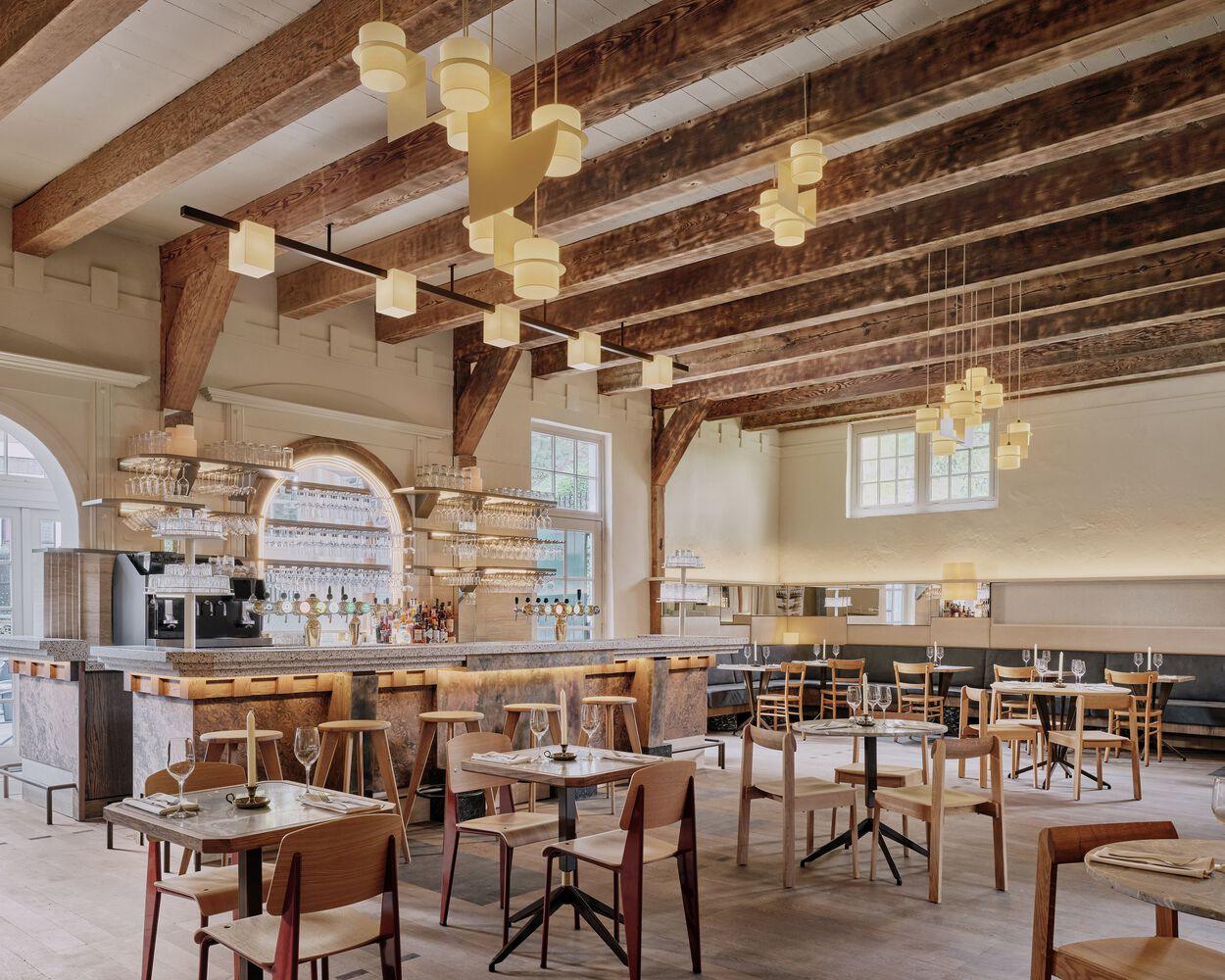 酒吧是划分用餐空间的一个关键特征。它无缝地融入了空间,同时吸引了人们的注意力,这要归功于米色水磨石台面和斜边的柜台。正面和侧面装饰着时髦的图案木皮、黄铜面板和脚下的深绿色水磨石块。在后杆上,多层反光弯曲金属装饰着一个中央拱门,将拱形光线反射到两侧玻璃架的水平线上。定制的木制酒吧凳配有漂亮的鼠尾草绿色皮革座椅,比众多的小桌子或一张大餐桌更休闲。这些桌子以圆形、方形和矩形的木制或蓝色大理石桌面为特色,并辅以一系列不拘一格的椅子,其中包括复古和设计经典。一排定制的轻质立方体悬挂在上面,与墙壁顶部的石膏块相呼应,为它们所指的城堡城垛增添了现代感。