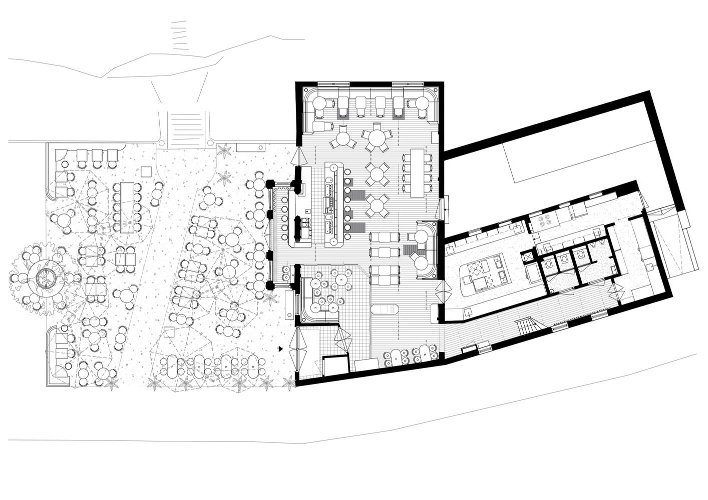 Terrace - The first thing guests see when descending from the Burcht van Leiden is a large terrace, whose boundaries are marked by two wooden corner benches with a custom round bench encircling the tree between them. A brasserie ambiance is exuded by the collection of tables and chairs, while a large communal table hosts larger groups. Playful tan-colored parasols, pigeon blue metal furniture, bespoke wooden seating elements and captivating graphics set the tone for the experience awaiting inside.