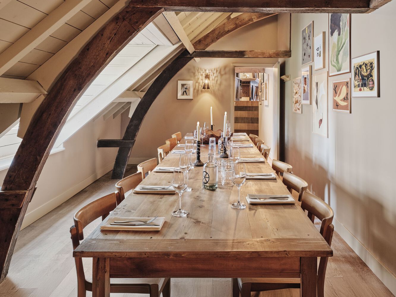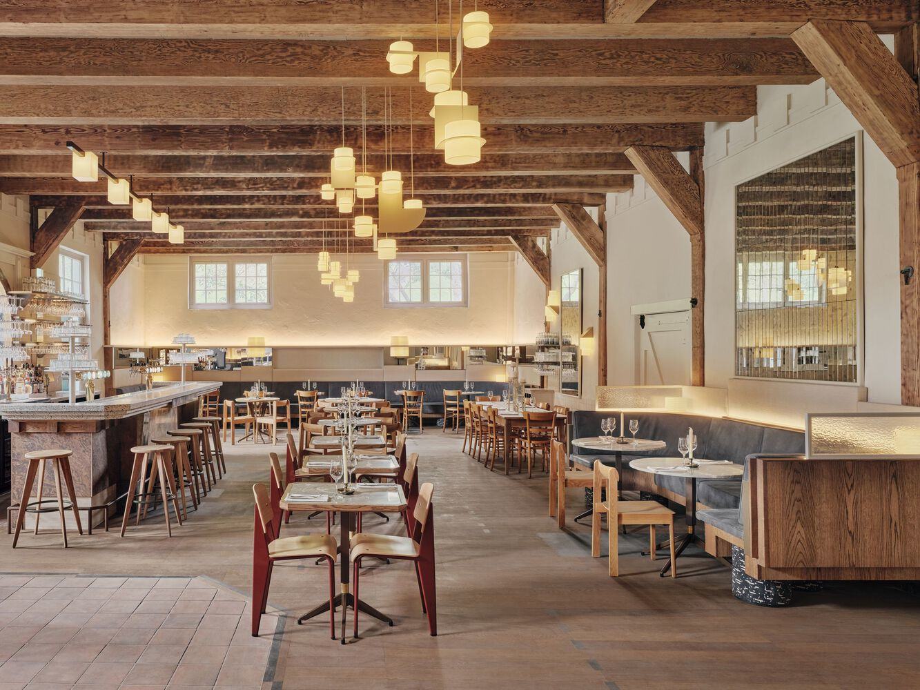 Three benches serve as a focal point for the main dining space: one is located by the side of the entrance, where it sits next to a plastered wall (featuring more vibrant artwork) and is complemented by warm brown terracotta floor tiles; the second is situated in the center of the wall facing the bar, highlighted by framed mirror pieces arranged in a geometric composition; the third is underneath high windows that look back up the hill towards the Burcht. In a nod to the original use of the building, the bench legs feature graceful details inspired by the carriages that would have been housed here hundreds of years ago.