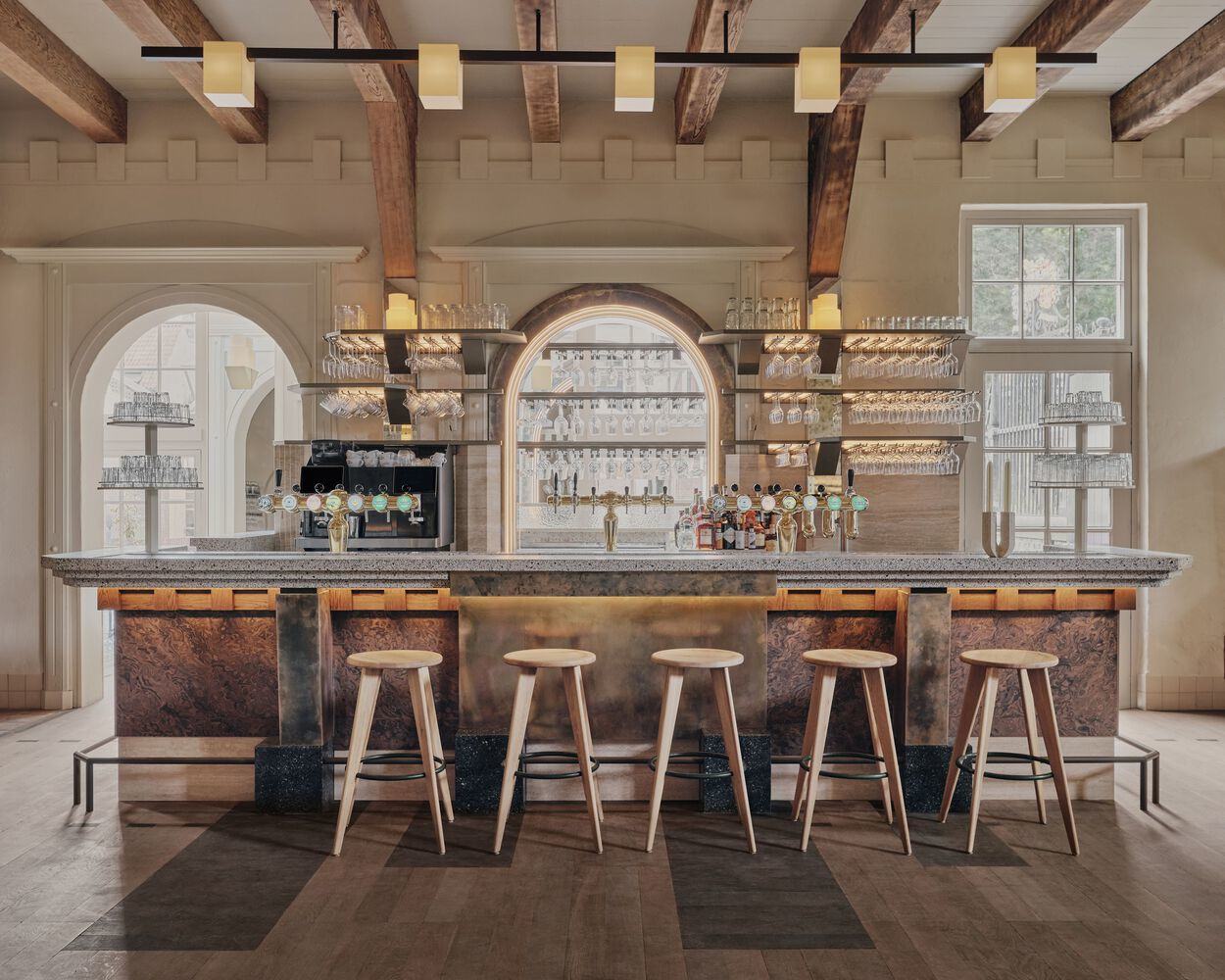 The wall finish in this area features smooth, wobbly light beige-colored stucco. The flooring consists of long wooden planks alternated with shorter planks, that transition to large black wooden graphic accents beneath the wall-mounted benches and green terrazzo blocks by the bar.Hidden around the back of the bar is a clandestine but lively space. Trace the lines of the bar and you'll see it extends around the arched openings to continue into the front porch. Painted in a slightly darker color, this niche features a wall table that enhances the 'greenhouse-like' atmosphere. It's a nice little perch for enjoying a drink while overlooking the picturesque square outside. After the sun goes down, a warm glow is provided by custom cylinder-shaped lights on a triangular-shaped base – which are spread throughout the entire ground floor.