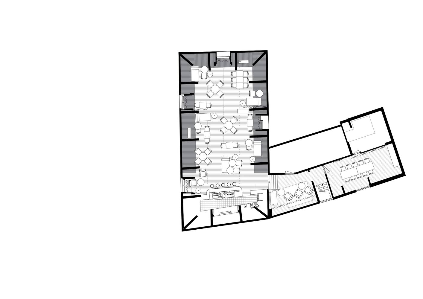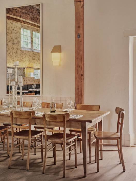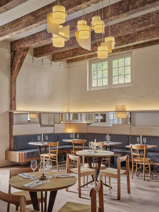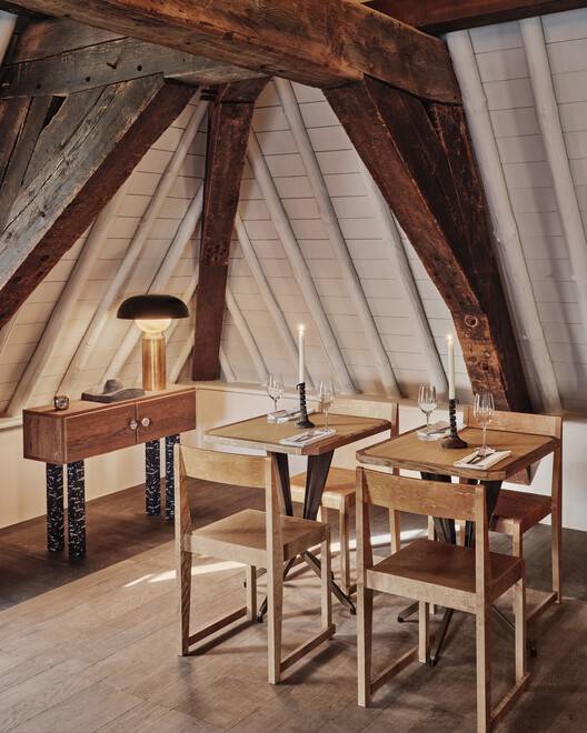 三条长凳是主用餐空间的焦点:一条位于入口一侧,紧挨着一堵抹灰墙(以更有活力的艺术品为特色),并辅以温暖的棕色赤土地砖;第二个位于面向酒吧的墙壁中央,由以几何构图排列的框架镜件突出显示;第三个是在高高的窗户下面,可以俯瞰山丘上的Burcht。为了纪念这座建筑的原始用途,长凳腿上的优雅细节灵感来自数百年前在这里停放的马车。