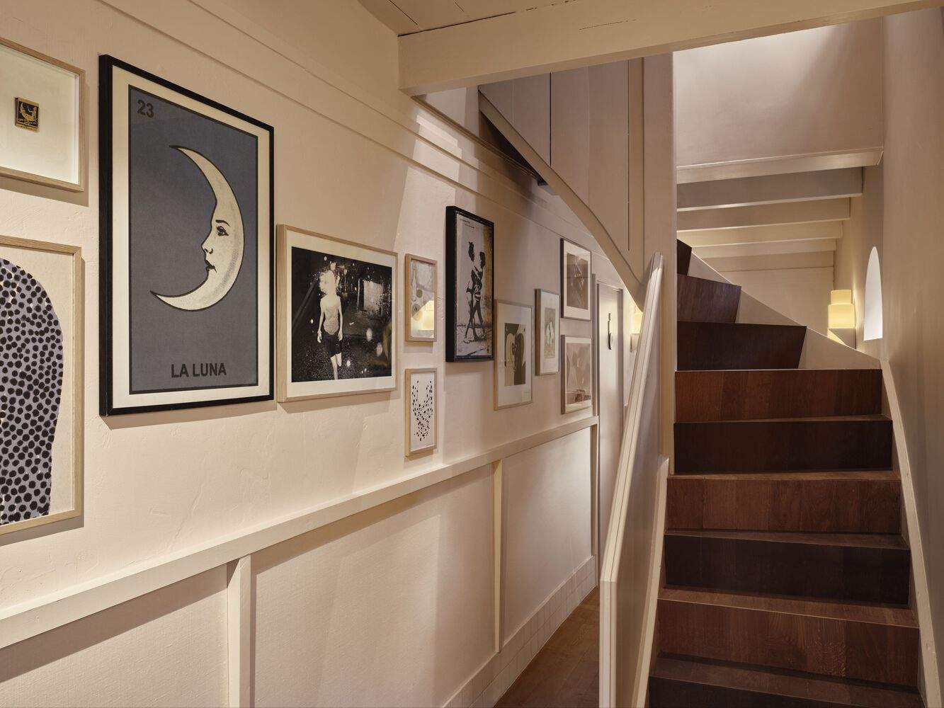 一楼-Hotel Rumour的楼下空间可以是您想要的任何地方:一个吃饭、喝酒或在夜晚结束时跳舞的地方。它充满了一系列吸引人的艺术品、座位选择和定制灯,提供了适合各种心情的东西。客人会受到两扇巨大的木门的欢迎,这扇门通往一个摆满艺术品和悬挂的皇家灯具的门厅。艺术作品与定制的灯光元素一起引导游客穿过空间。在右边,一个复古橱柜展示着各种各样的葡萄酒,两侧是两张高桌,靠在墙上,墙上装饰着定制的古铜色镜子和灯。