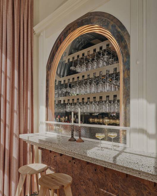 该区域的墙面以光滑、不稳定的浅米色灰泥为特色。地板由长木板和短木板交替组成,在壁挂式长椅和酒吧旁的绿色水磨石块下过渡到大型黑色木制图案。酒吧后面隐藏着一个秘密但热闹的空间。沿着酒吧的线条,你会看到它沿着拱形开口延伸,一直延伸到前廊。这个壁龛的颜色稍微深一点,墙上有一张桌子,增强了“温室般”的氛围。这是一个很好的小栖木,可以一边俯瞰外面风景如画的广场一边喝一杯。日落后,三角形底座上的定制圆柱形灯会发出温暖的光芒,这些灯遍布整个一楼。