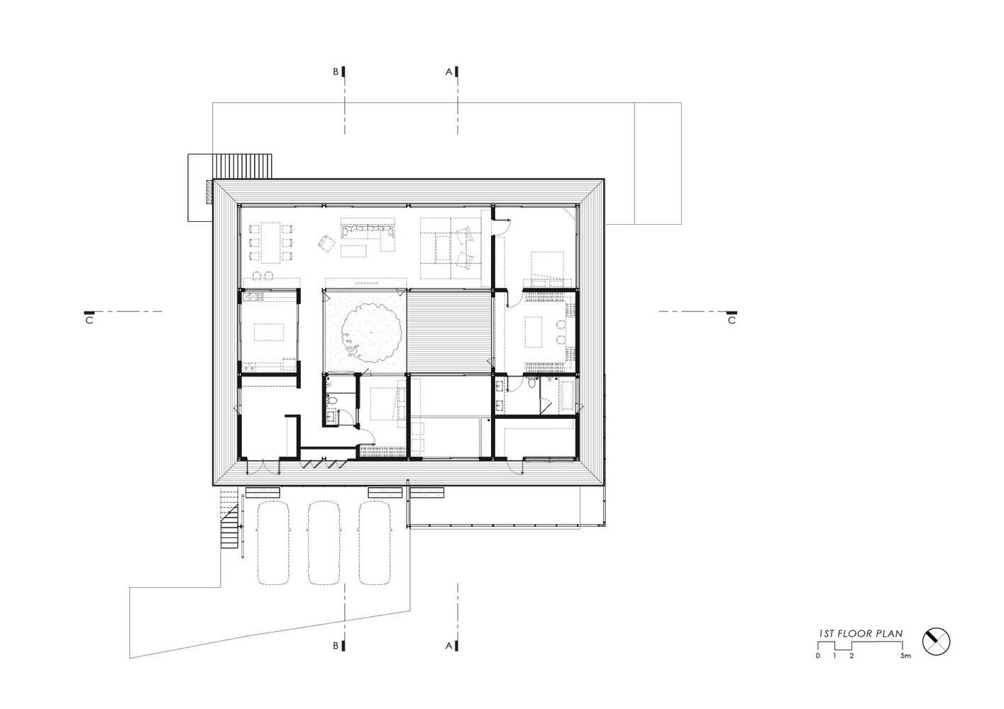 建筑师将建筑设计成一个简单的矩形盒子,这使得布局简单高效。建筑的中心是一个室外庭院,是将自然光和周围氛围引入室内空间的关键因素。平面图允许在整个房子周围流通,房间的布置使每个房间的两侧都有玻璃墙——一个面向庭院,另一个朝向周围的自然景观。这种布置促进了房间内的气流,有助于减少室内热量,降低制冷能耗。