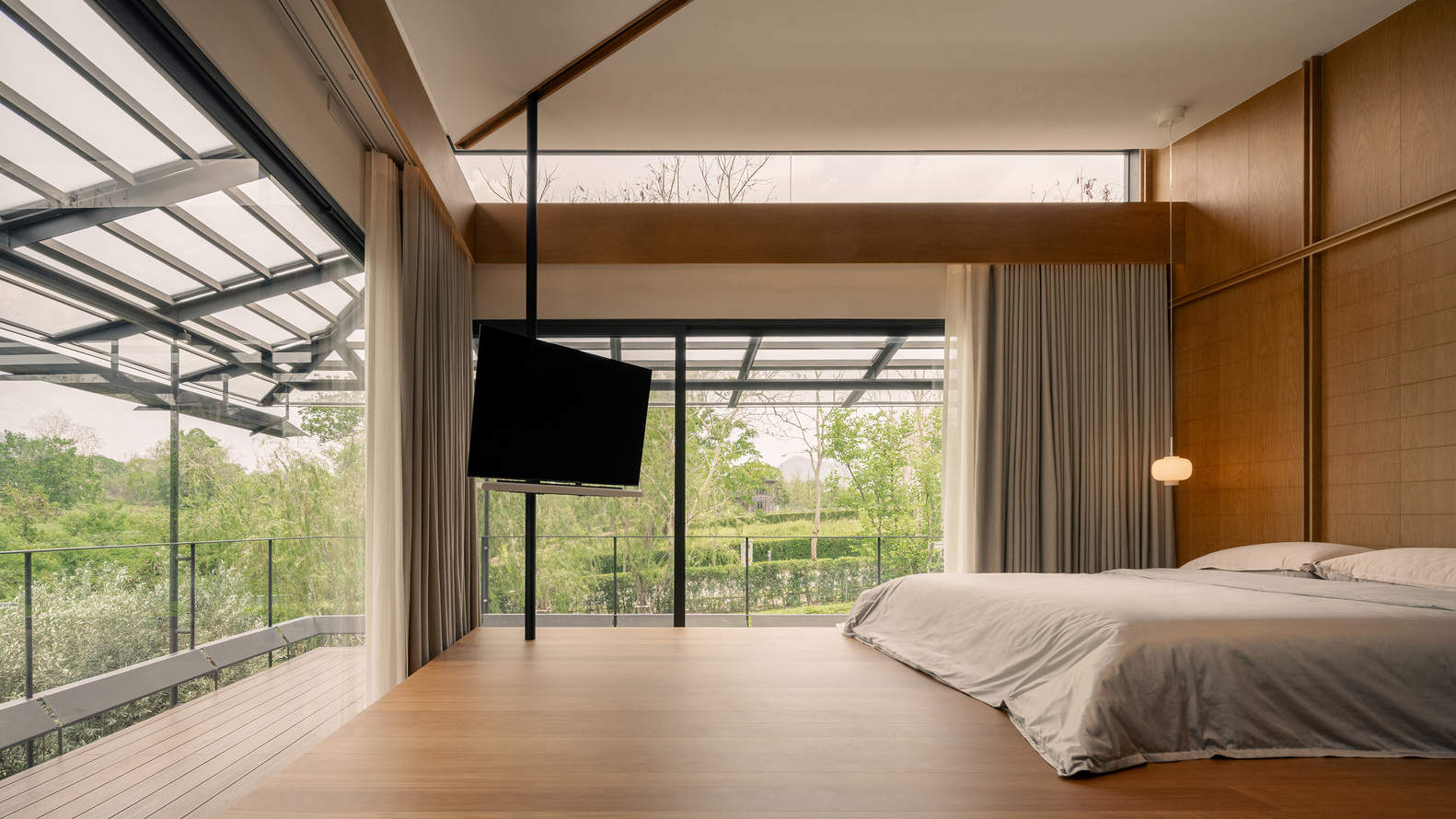 巧妙的空间利用与通风设计:项目的核心在于其对于空间和环境的巧妙结合。首先,建筑下方的“tai thun”空间,既是泰国传统建筑的现代演绎,又提供了额外的户外活动空间,增强了居住的舒适性。其次,矩形盒子的设计和室外庭院的设置,极大地优化了自然光的引入和室内空气流通。每个房间都拥有两面玻璃墙,一面朝向庭院,另一面朝向自然景观,实现了室内外空间的无缝连接,促进了空气的流通,降低了室内温度,减少了对能源的依赖。这种设计方案充分考虑了热带气候的特点,体现了对被动式设计的巧妙运用。