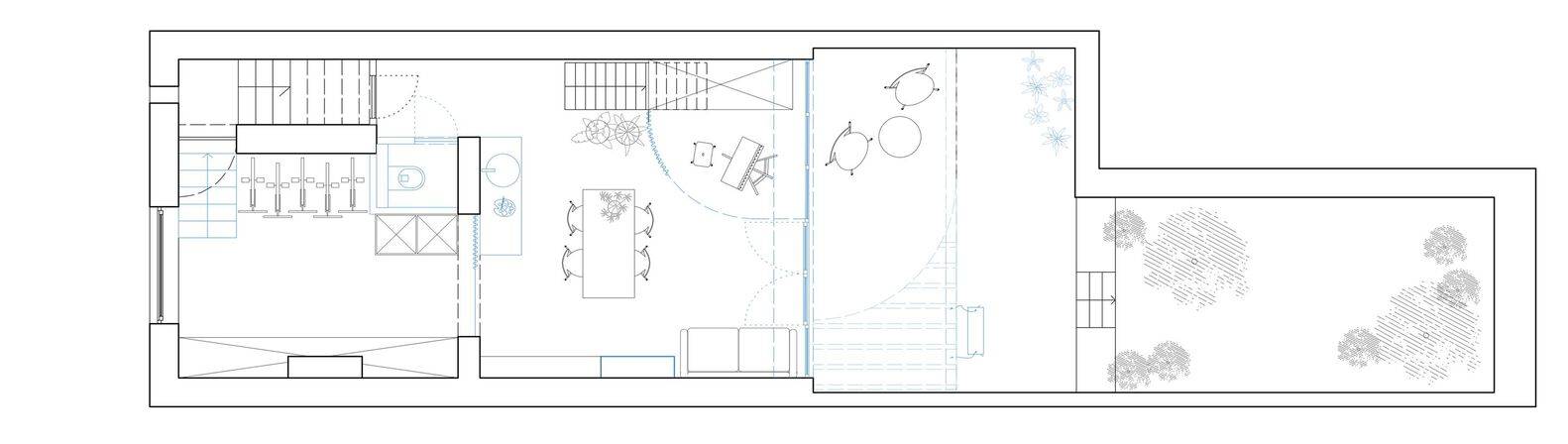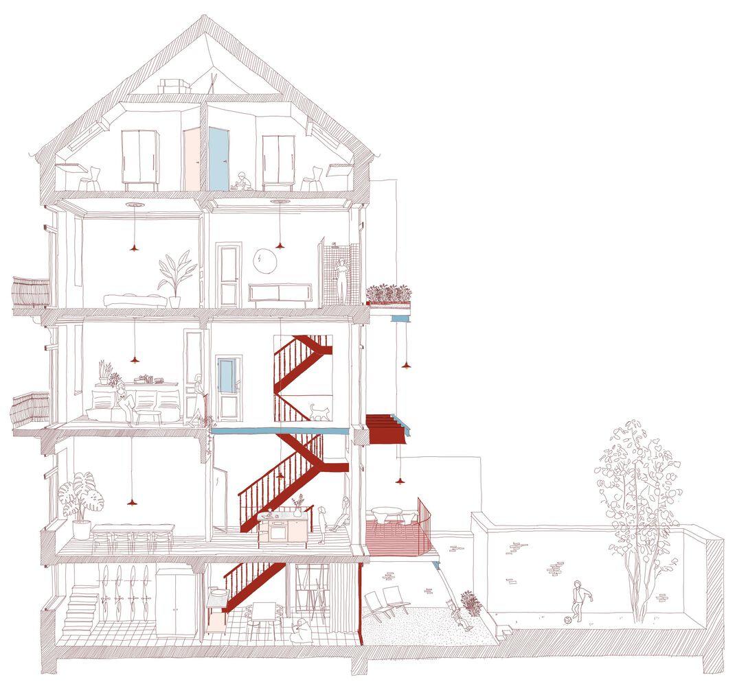 客户的要求是重新组织和连接生活区。在最低的两层,他们想引入更多的自然光,开放空间,并为Kaat提供一个工作室。由于喜欢联排别墅和原始的“未完成”美学,他们已经有了清晰的愿景。尽管如此,他们还是欢迎新的建筑观点和材料建议。hé的提议!包括拆除旧附属建筑,垂直重组生活空间,创造更多的户外空间。建筑师还将白天和夜晚的区域更均匀地重新分配到房子的五层。