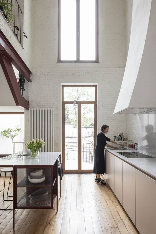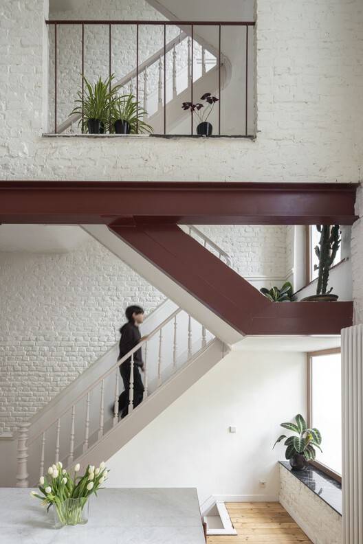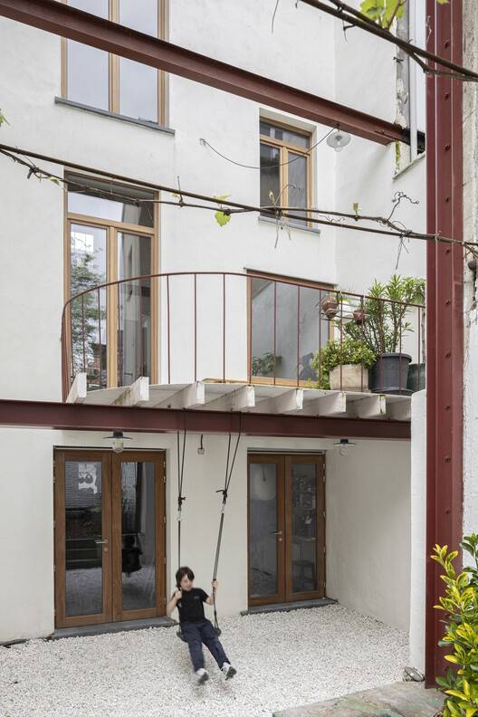Text description provided by the architects. Kaat restores artworks, and Thomas works for the VRT. They bought a typical, narrow house in the Brussels sub-municipality of Anderlecht for their family of three children. The house was cluttered with several small outbuildings and a tiny garden. The main asset was the clear view towards the back, allowing natural light to flood in during the morning and afternoon. The visual axis ends in a view of the former Veterinary School, a monumental complex from the 19th century.