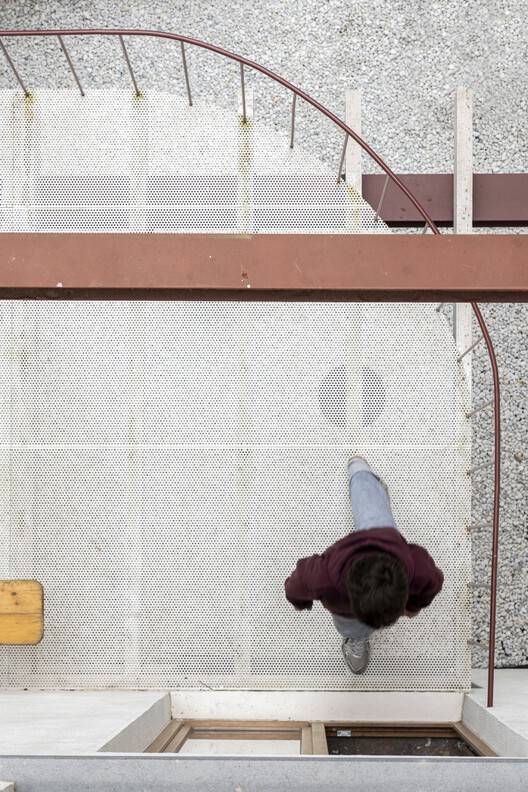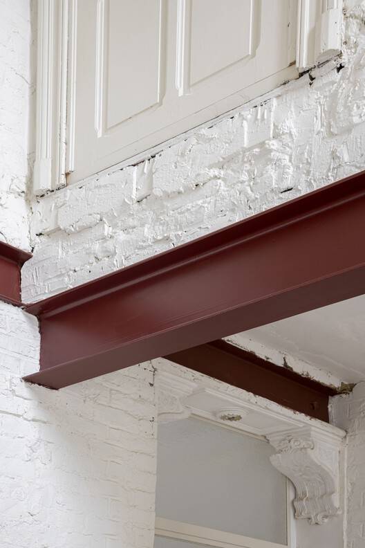 材料的再利用与“未完成”美学:项目的精髓之一在于对材料的再利用以及“未完成”美学的运用。 建筑师保留并重新利用了旧附属建筑的横向钢梁,用于支持户外照明、攀爬植物和遮阳棚,这种设计不仅环保,还为建筑赋予了独特的工业美感。 再利用的理念贯穿整个项目,例如从布鲁塞尔北站回收的大理石板被用于浴室和厨房的工作台。 暴露的砖砌体和石灰水处理也体现了建筑师对原始、未完成质感的追求,这种设计语言在预算允许的条件下,营造出一种独特而富有魅力的氛围, 凸显了设计干预的独特性和深度。