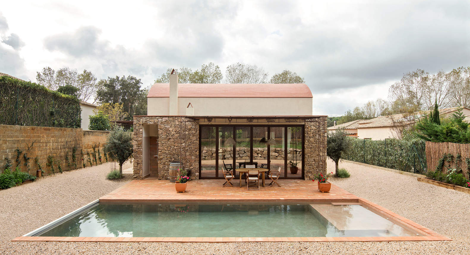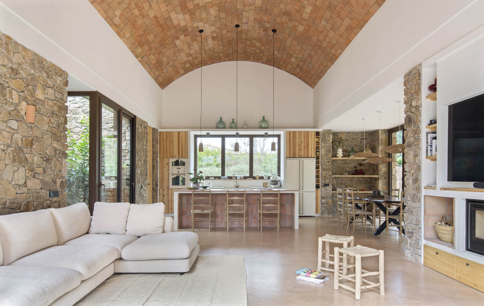 The configuration of the house is simple in its structural clarity: four vaults cover the main spaces, supported by thick-walled boxes and flat roofs that counteract the thrusts of the vaults, which are used for services such as cleaning and storage. The vaults are 5 meters wide and 9 meters long, traditional dimensions that respect the proportions of the old fishermen's huts of Calella de Palafrugell and, at the same time, adapt to the terrain. The service boxes maintain a proportion of half to the vaults. These act as elements of regulation of the building, mainly at the climatic level.