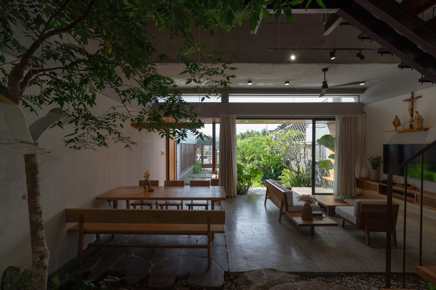 2. Transitional spaces: Inside / In-between / Outside – The house applies both "inside-out" and "outside-in" design strategies to connect interior and exterior spaces through multiple layers of architecture and landscape. This approach adds spatial depth and softens the boundary between indoor and outdoor areas, creating an experience similar to a slow, continuous walk. The use of landscape materials within interior spaces also helps blend the building with nature.