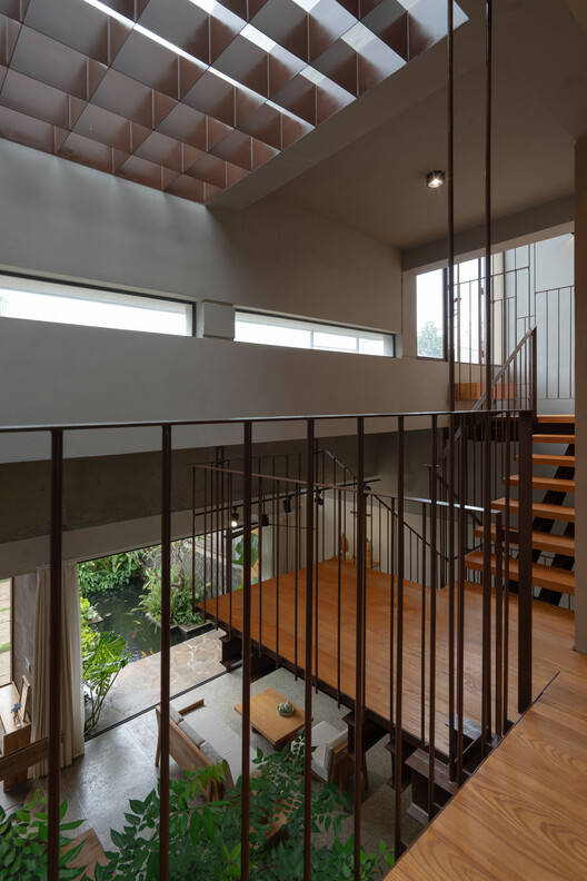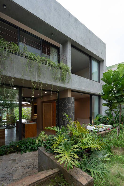 建筑师提供的文字描述。这栋房子位于Buon Ma Thuot市郊区的一个半城市地区,在一块7x40米的土地上,向山谷缓缓倾斜。它是为一个四口之家设计的——一对夫妇和他们的两个儿子。