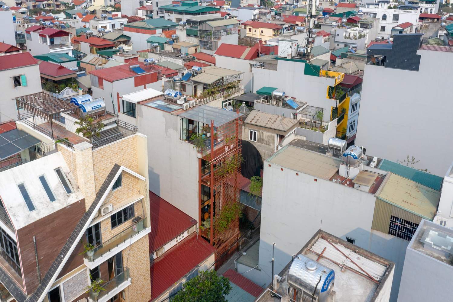 The front of the house is a setback area according to planning regulations, where it is impossible to build with concrete, but opens up opportunities for a lighter structure. We chose to install a hollow steel floor system with a facade woven with thin steel strips, simulating the appearance of "liếp tre" - traditional bamboo blinds. This structure serves multiple roles: it functions as a balcony, a seasonal buffer, a vertical garden, or simply as a flowing steel curtain mediating between the house and the streetscape. It is also a quiet metaphor for how traditional Vietnamese architecture engages with nature softly, thoughtfully, and adaptably.
