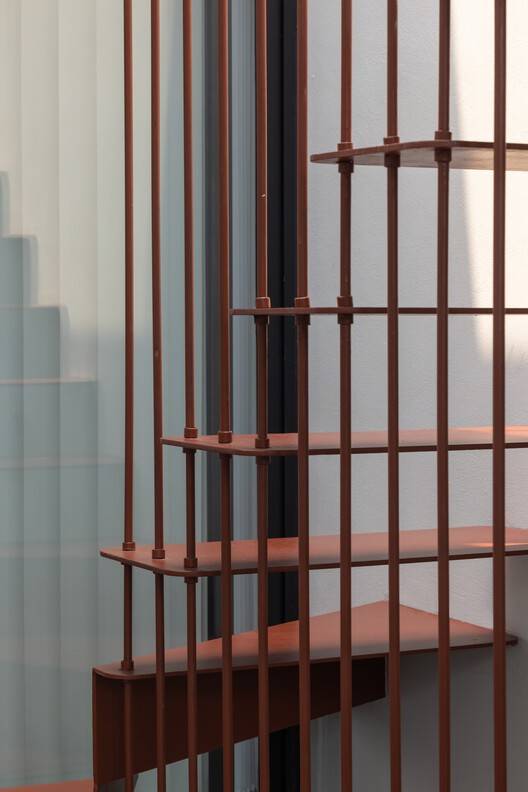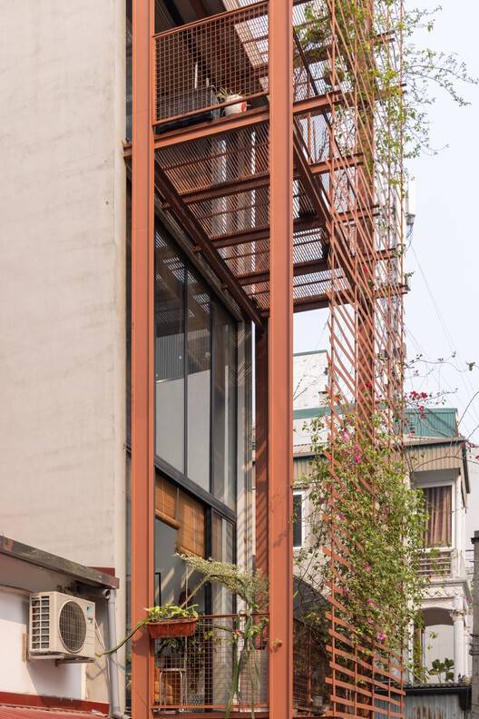 根据规划规定,房子的前部是一个后退区域,在那里不可能用混凝土建造,但为更轻的结构提供了机会。我们选择安装一个空心钢地板系统,其立面由薄钢带编织而成,模拟“李”的外观ếp tre”-传统的竹百叶窗。这种结构具有多种作用:它可以作为阳台、季节性缓冲区、垂直花园,也可以简单地作为房屋和街景之间的流动钢帘。它也是越南传统建筑如何温柔、周到、适应性地与自然互动的安静隐喻。