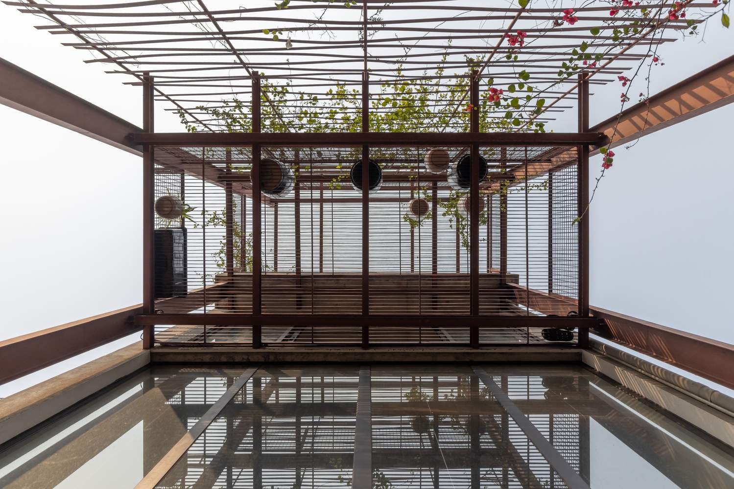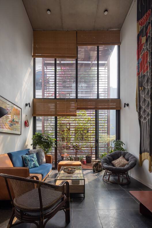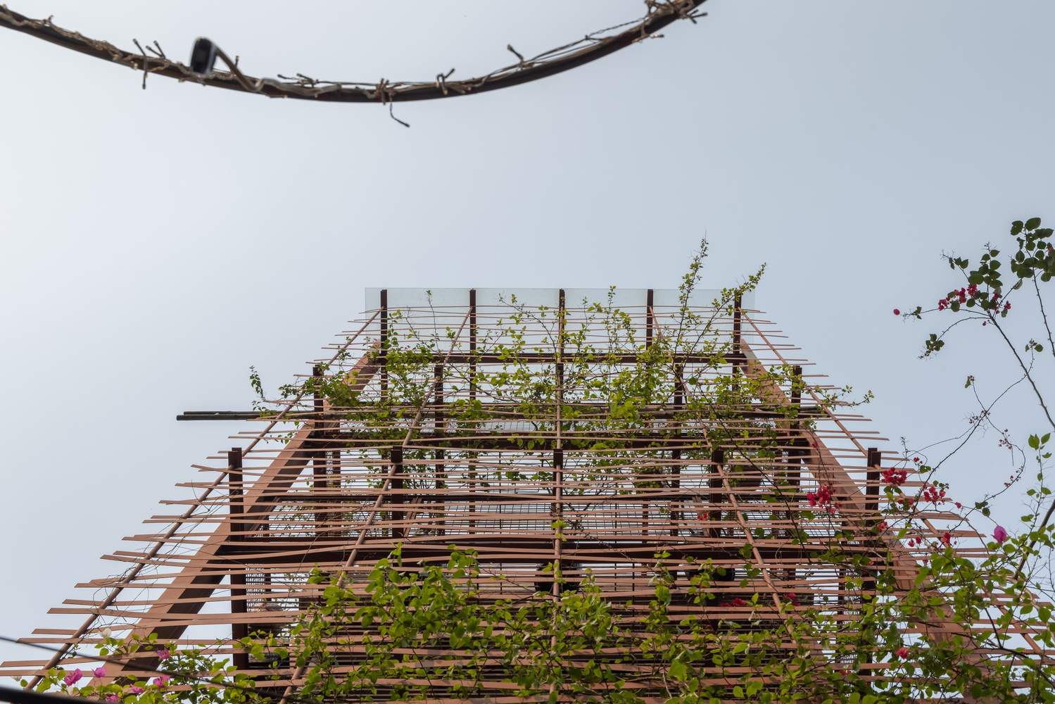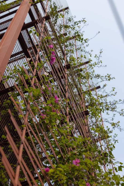 立面设计与文化传承:项目的立面设计是其另一大亮点。设计者巧妙地利用规划法规中的后退空间,采用了轻盈的空心钢地板系统,结合模拟“李ếp tre”竹百叶窗的薄钢带编织立面,为建筑赋予了独特的视觉效果。这种设计不仅实现了阳台、季节性缓冲区和垂直花园的多重功能,还在建筑与街景之间形成了一种微妙的过渡。更重要的是,它巧妙地运用了越南传统建筑的元素,传达了对自然的敬畏和对本土文化的尊重,使建筑在现代语境下焕发出独特的韵味,体现了对地域文脉的深刻理解。
