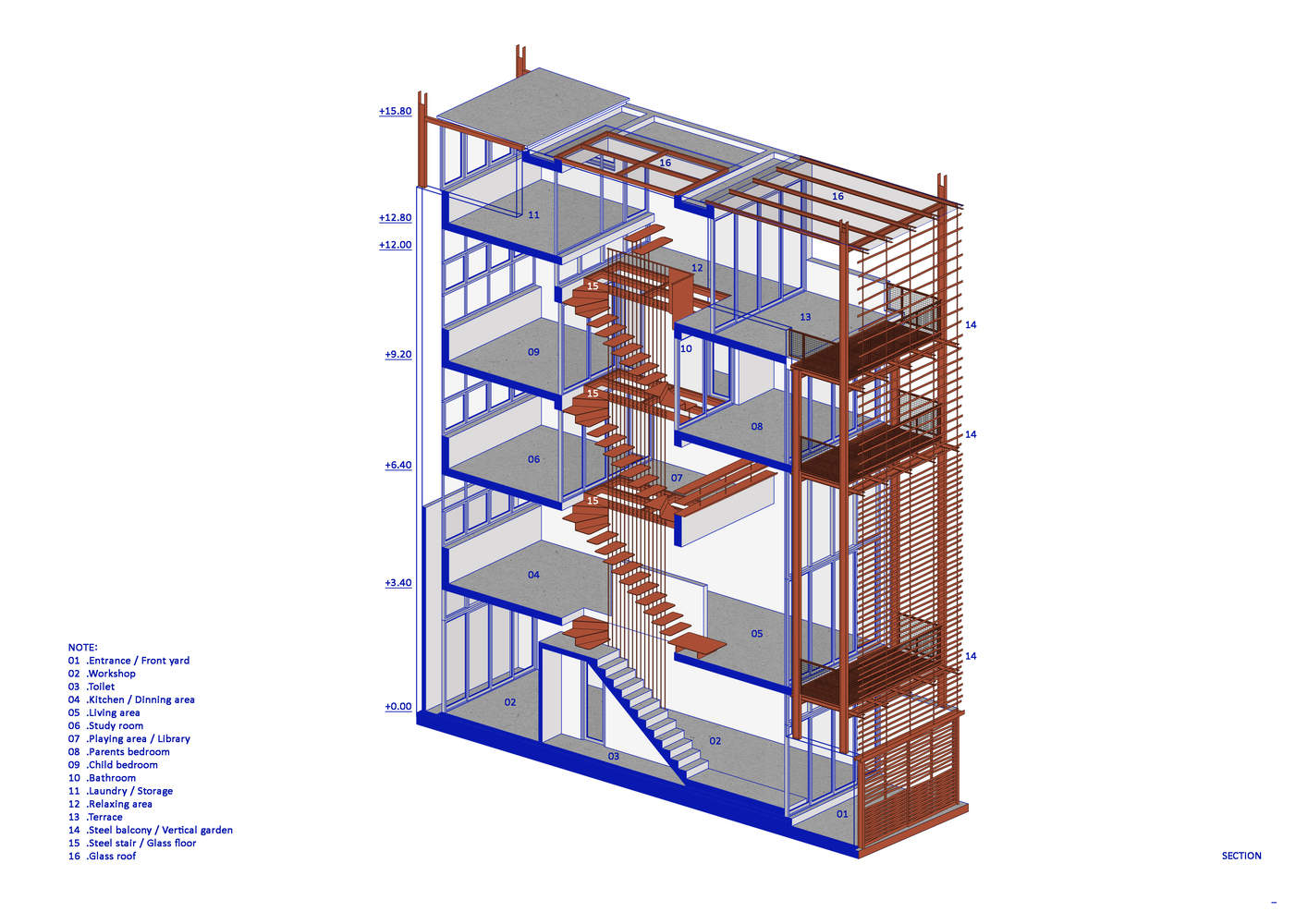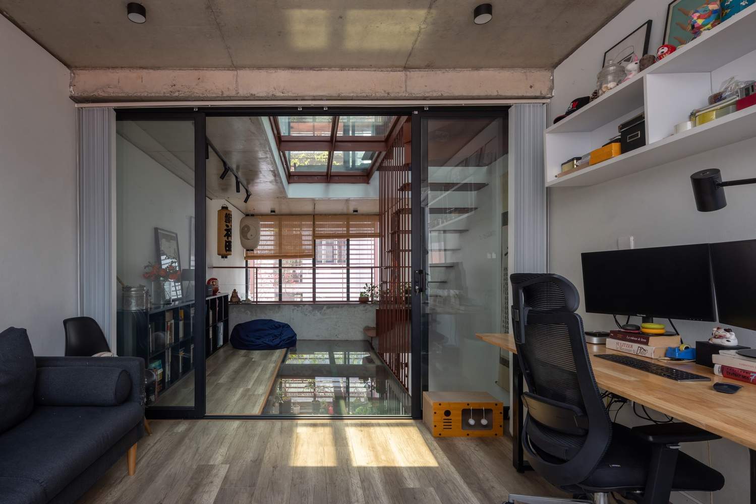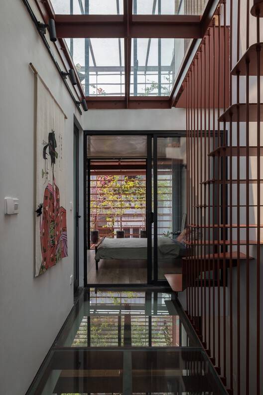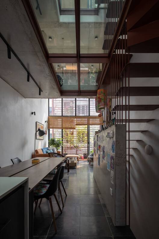 On the lower floor, the owner's workplace is open, using almost the entire area. The functional areas, such as the living room, kitchen, dining table, bedroom, etc., of the family are placed on the upper floors. Having a limited width of only 4 meters, the space organization solution requires efficiency, maintaining ventilation, and internal connectivity. Instead, we designed a transparent-floored corridor combined with a hollow steel ladder, a flexible structure that plays the role of a traffic platform, a place to get natural light and ventilation, while opening up a seamless vertical connection throughout the house. This not only enhances spatial clarity but also fosters everyday interaction among family members.