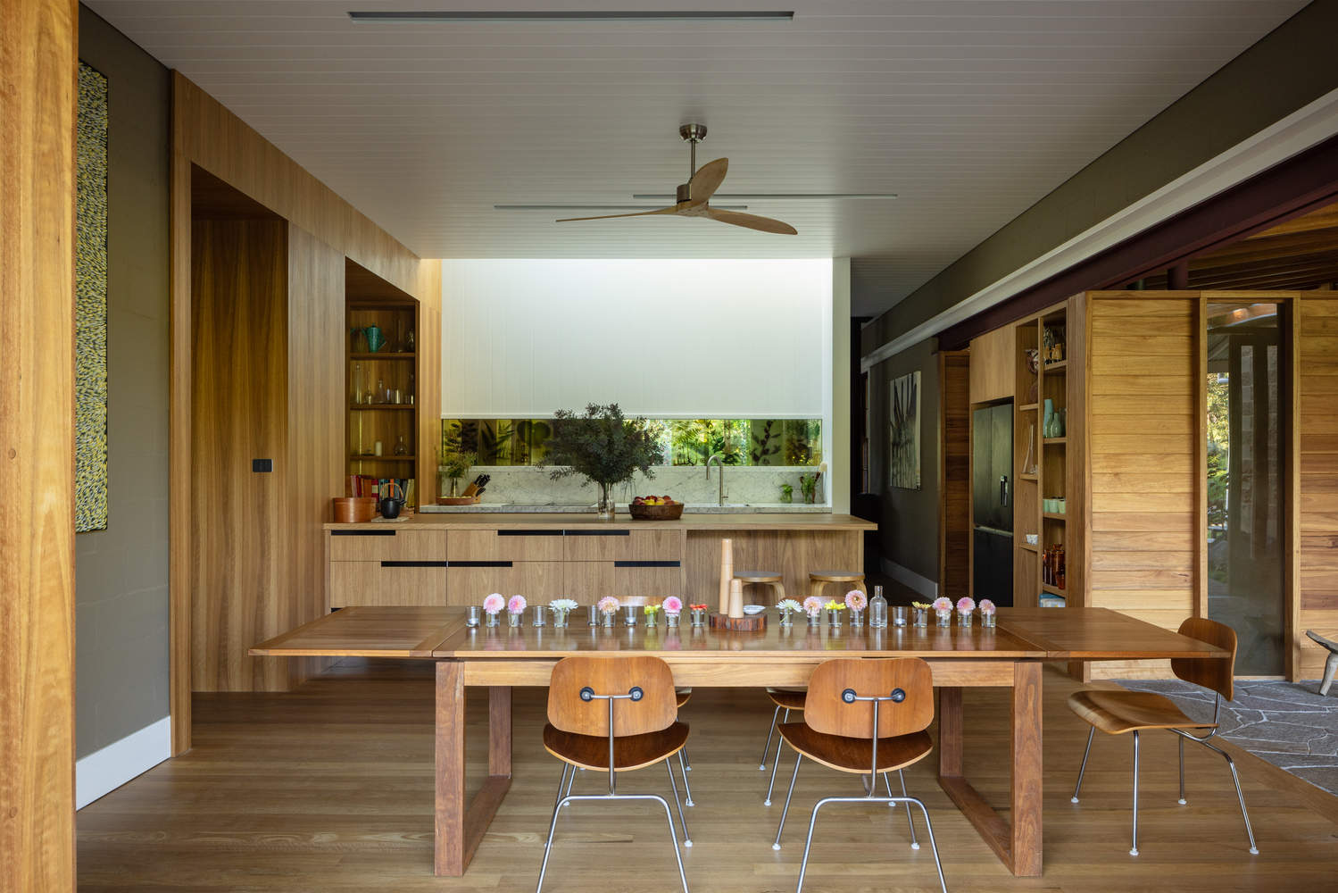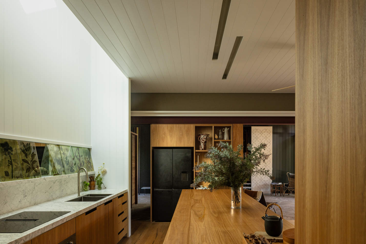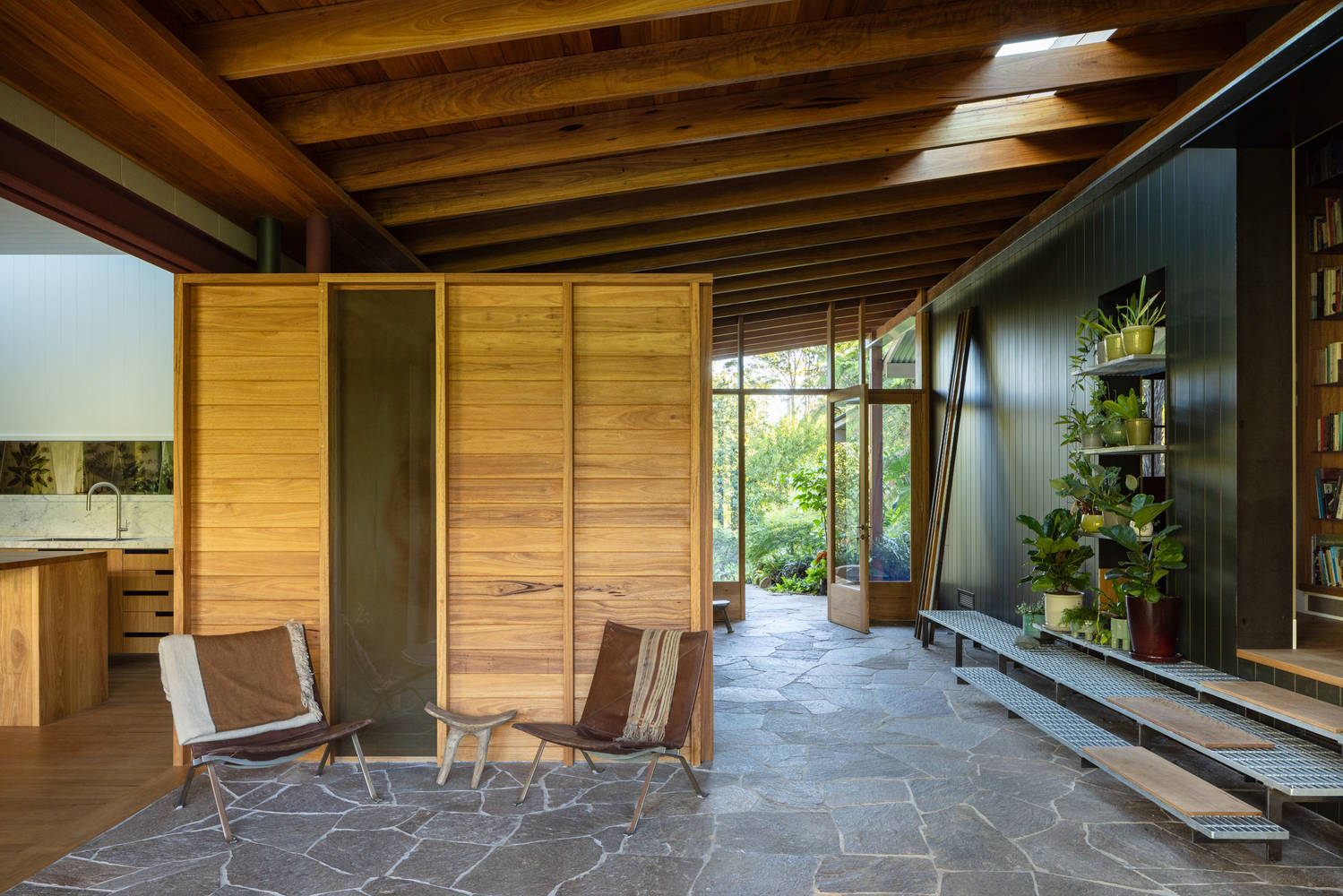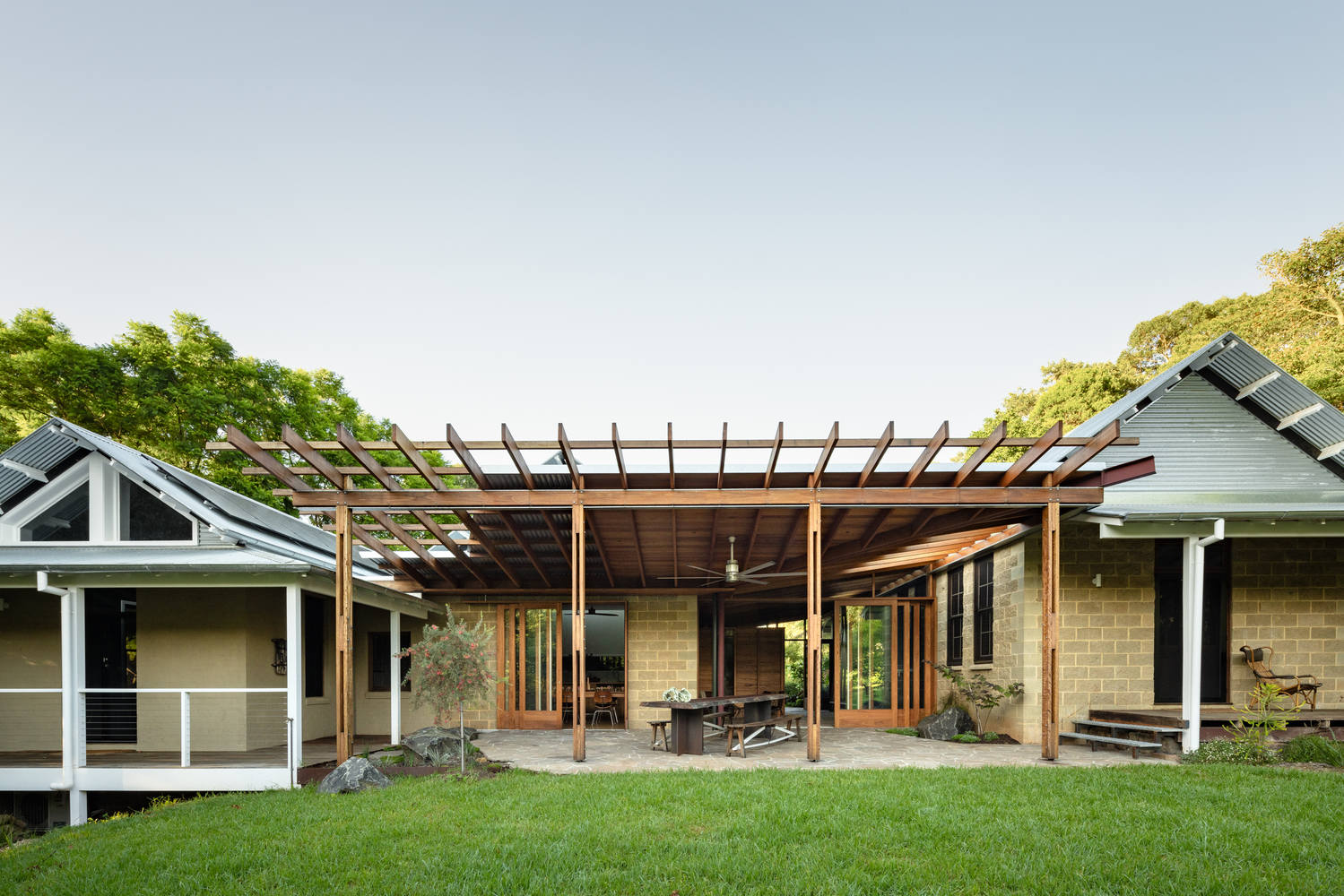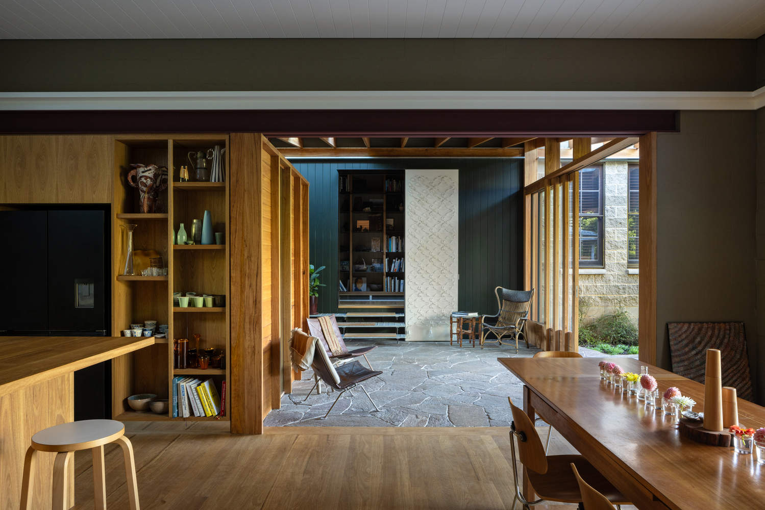 The original home consisted of three pavilions joined by verandahs, a nod to early Euro-Australian rural architecture. Rather than demolish, Studio ZAWA reinterpreted this vernacular to place the verandah not as a secondary or transitional space, but at the architectural and social heart of the home. A new linking verandah creates a shaded, open-air living space, its Blackbutt ceiling directing breezes through the house, while granite paving extends seamlessly from the garden indoors, allowing life to spill easily between the two.