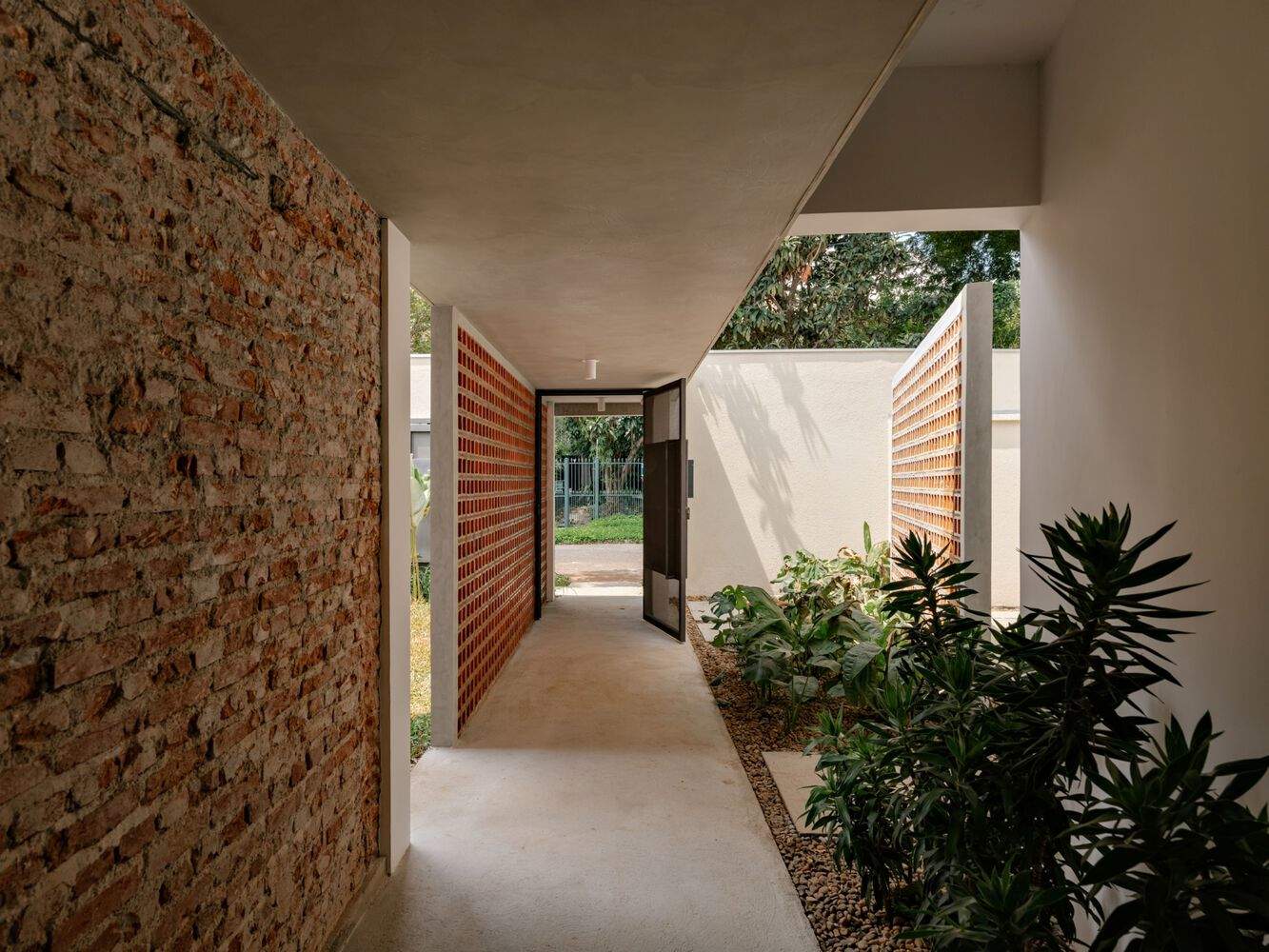 The main entrance was one of the project´s biggest challengs, as it forms the first impression of the house. Previously, a narrow, dark, and unwelcoming hallway greeted visitors. Since this first impression take a crucial role in choosing a rental property, we dedicated a loto f design time to solve this issue in a simple way . The solution was to chamfer on of th walls, lower the height of the roof, and expose de brickwork by stripping the wall coat. These three interventions combined completely changed the proportions and feeling of arrival – now, the house gives a much warmer and more inviting welcome.
