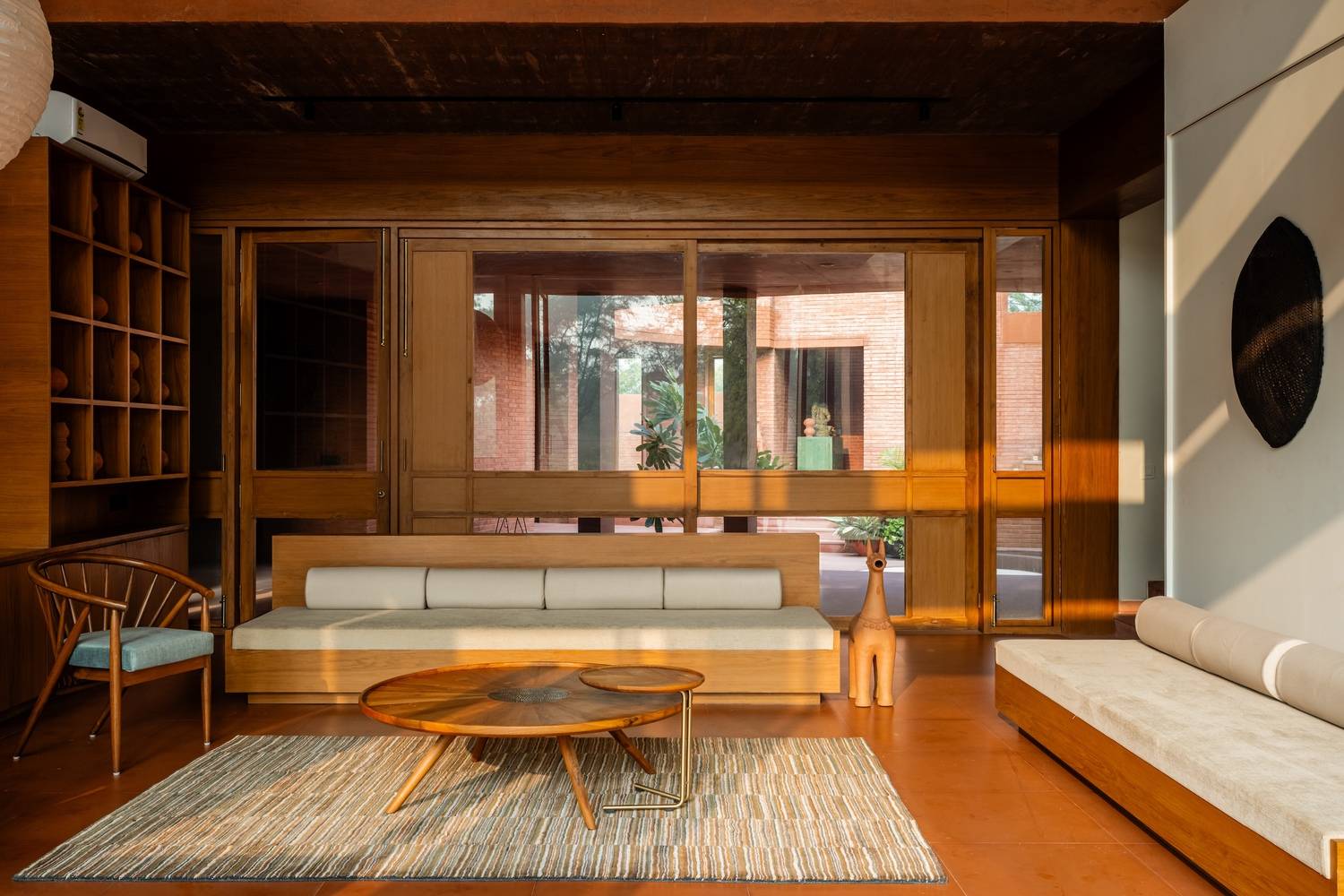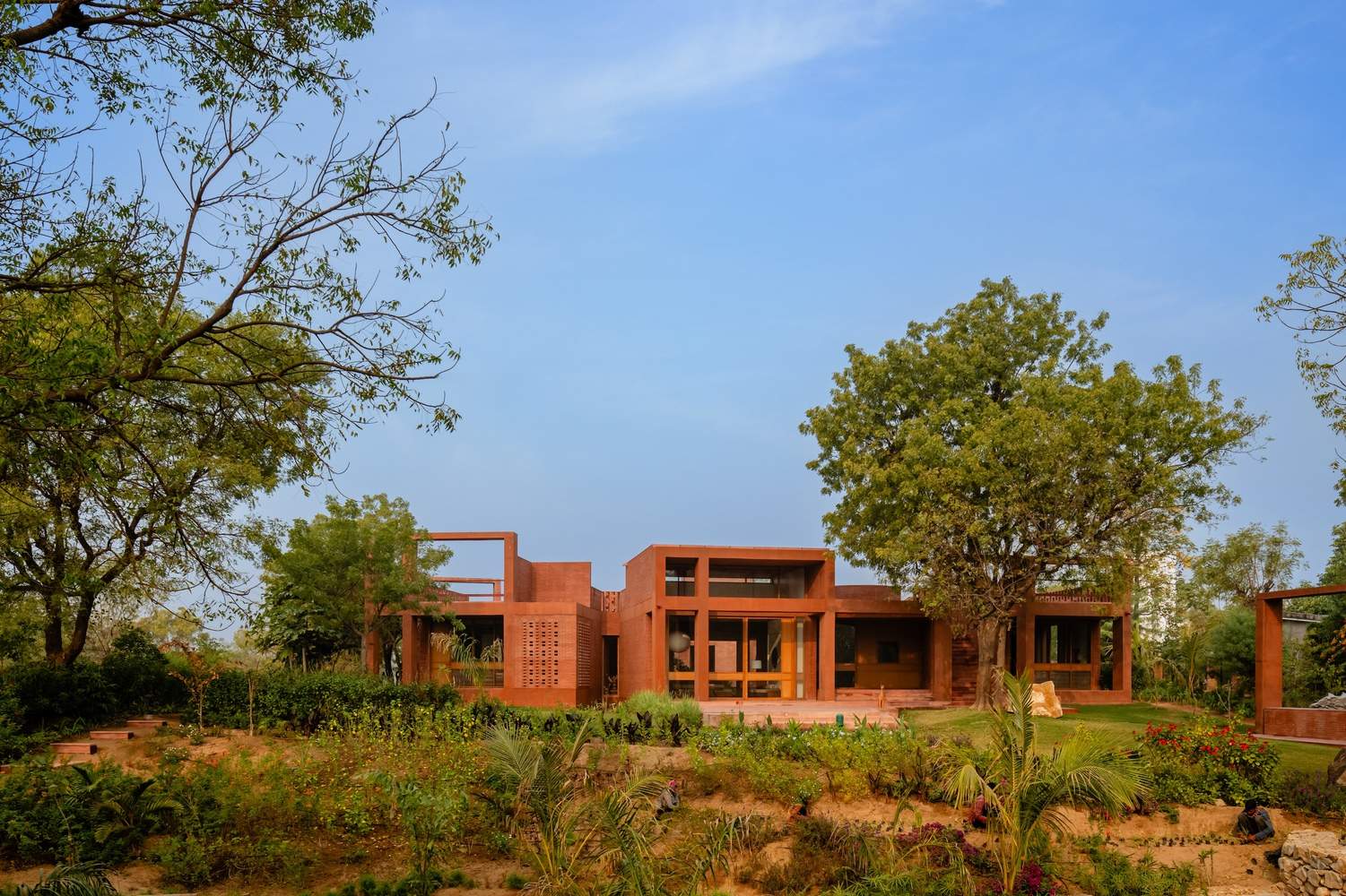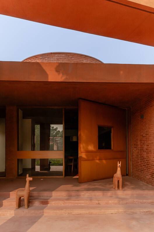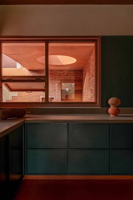 Text description provided by the architects. The Alloa Hills Weekend Home was designed for a couple deeply committed to micro-financing in the rural areas in India, seeking a peaceful retreat where they could unwind and reconnect with nature amid their hectic professional lives. Nestled in the undulating landscape near the Sabarmati River, the home serves as a sanctuary, not only for the couple but also for visiting writers, artists, and filmmakers, offering them a tranquil environment for creativity. The design prioritises harmony with nature, featuring an open interior courtyard that draws the landscape inside, framing views from every angle.