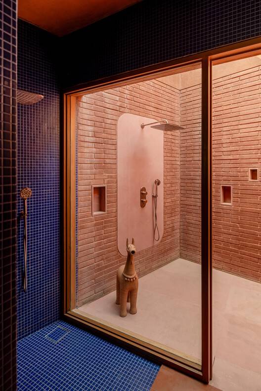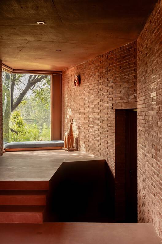Terracotta is the unifying material throughout the home, from the pigmented concrete to the bricks and flooring. This cohesive material palette ties the space together, creating a seamless flow from the interior to the terrace and extending upward to form a multilayered living experience.