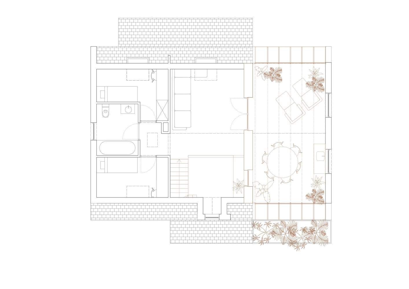 The former hallway and office unfold into a new living room that opens onto the winter garden. The once-generous entrance hall becomes a cozy seating area by the earthen stove, which replaces the old oil boiler and now provides central heating. The former garage has been transformed into the new entrance. The white interior walls are now finished with a red clay plaster. On the ground floor, a spacious bedroom and compact bathroom ensure the home is suitable for lifelong living.