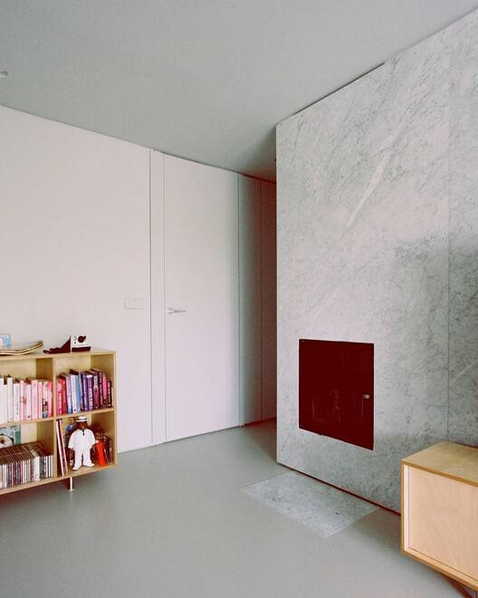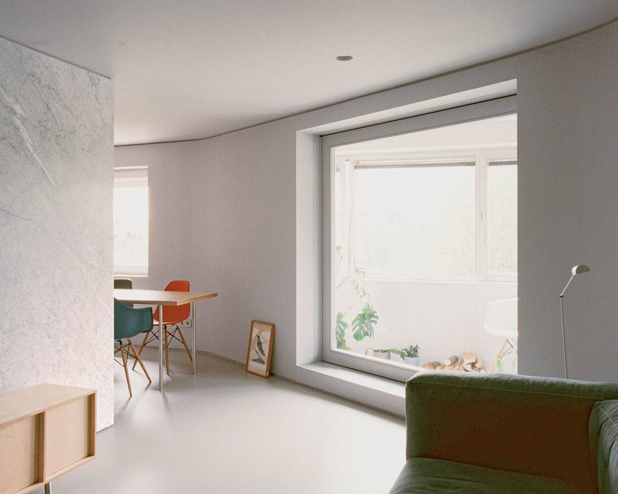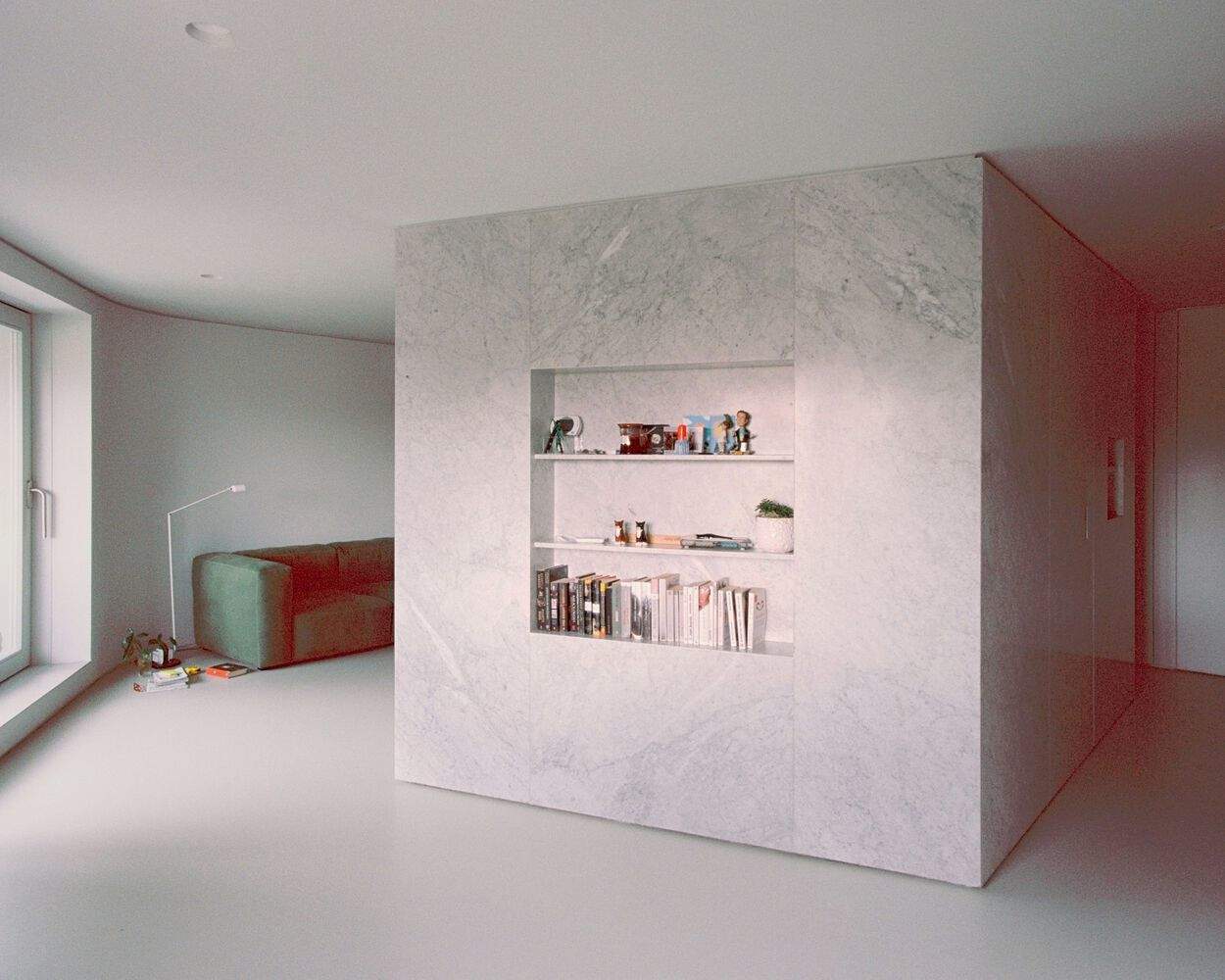 The main idea of the renovation was to combine all the living areas into an open, unified space that encircles a freestanding monolith, clad completely in Carrara marble. This stone core consists of a fireplace and a marble bathroom.