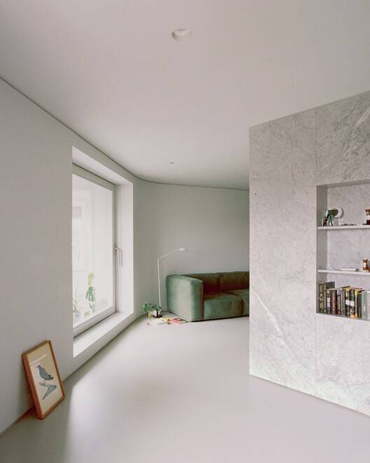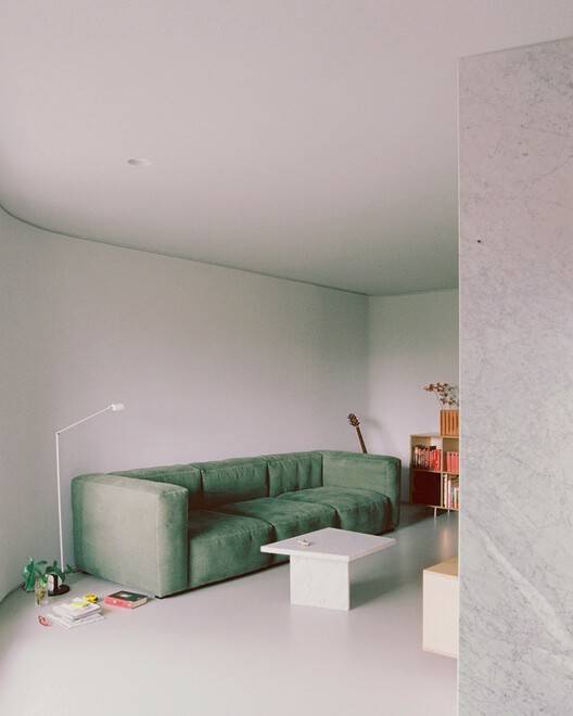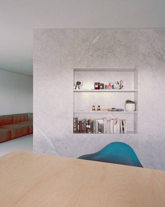 材料与细节的统一性:设计中对材料和色彩的统一性运用是其成功的关键。浅灰色聚氨酯地板、墙面石膏和内置家具的色彩搭配,营造了统一而和谐的中性基调。这种色彩策略不仅突出了生活区的整体性,也为居住者提供了舒适的视觉体验。同时,设计师还注重细节,例如餐桌和储物单元的设计,以及剩余大理石的利用,都体现了对材料的充分利用和对整体风格的把握。整体设计呈现出简约、现代的风格,同时兼顾了实用性和美观性,展现了设计师对整体空间和细节的卓越把控能力。