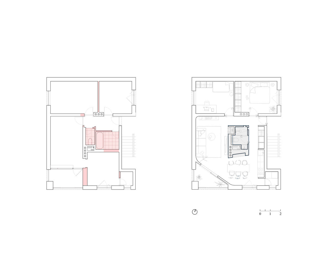 建筑师提供的文字描述。我们翻修了位于卢布尔雅那市中心的一栋20世纪60年代典型住宅楼中的一套公寓。现有的平面图被分割成许多小空间,厨房只能通过客厅进入。