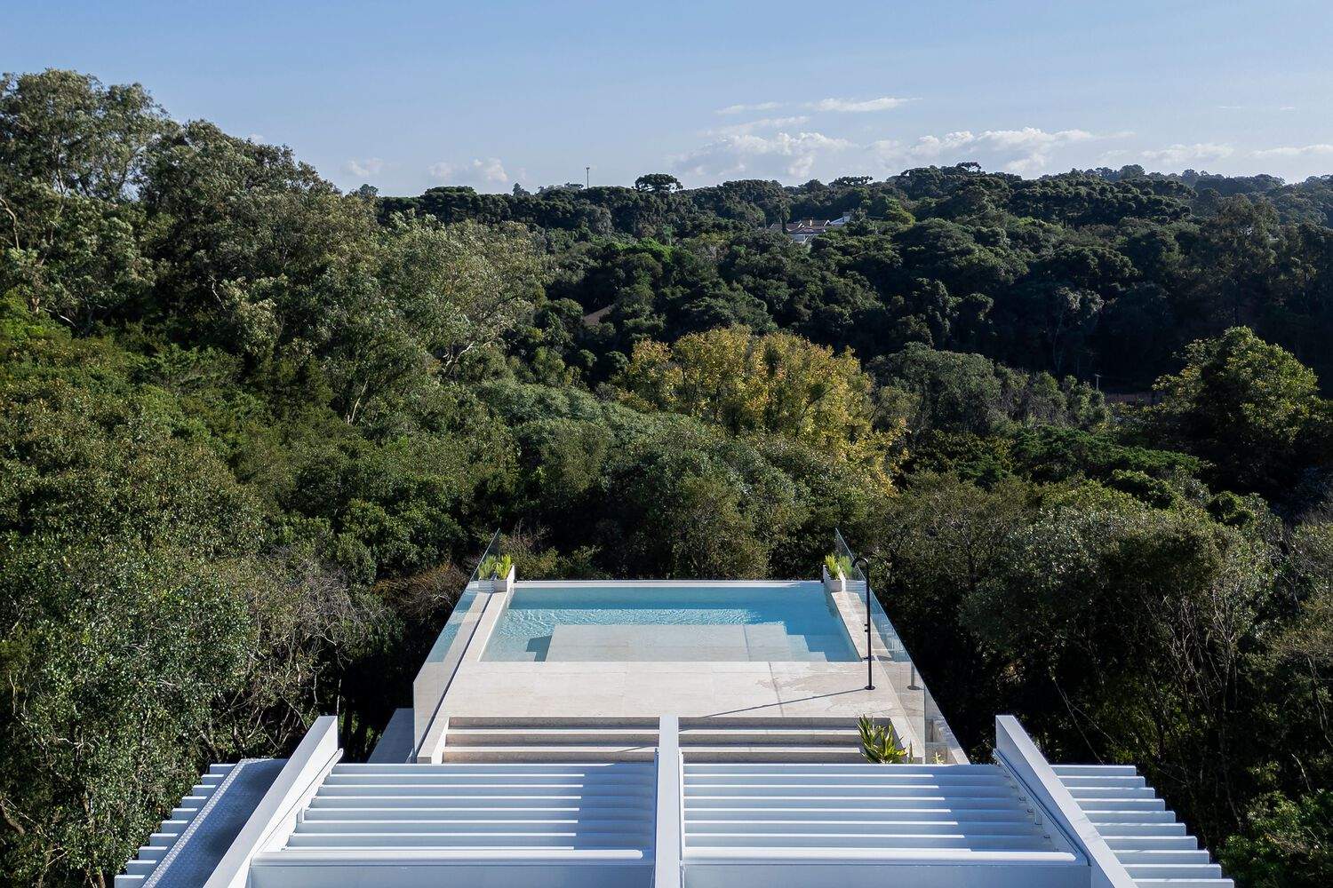 As if a second structure were delicately resting atop the lower mass, the attic consists of a white steel frame with wide eaves and pergolas. It is enclosed in glass and surrounded by landscaped terraces and an infinity-edge pool that projects over the forest—a light, transparent counterpoint to the stone volume anchored to the terrain.