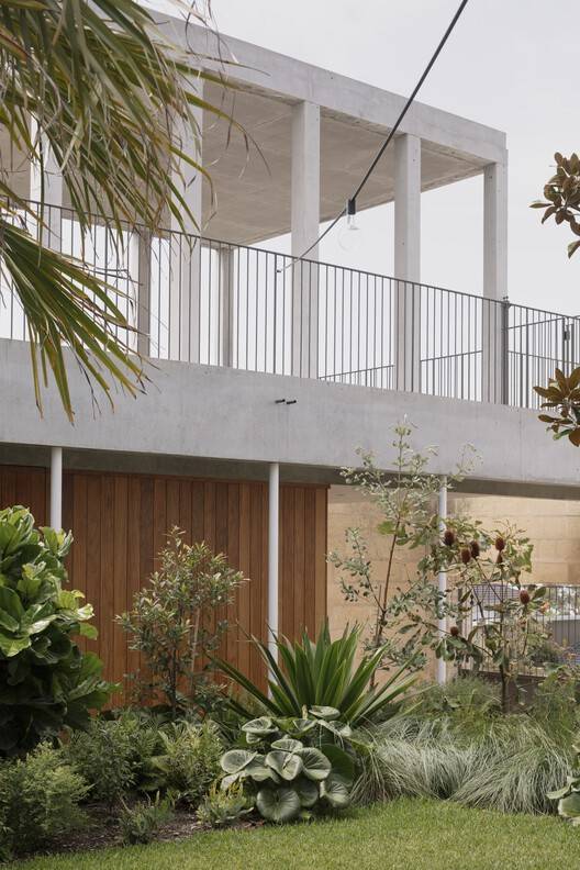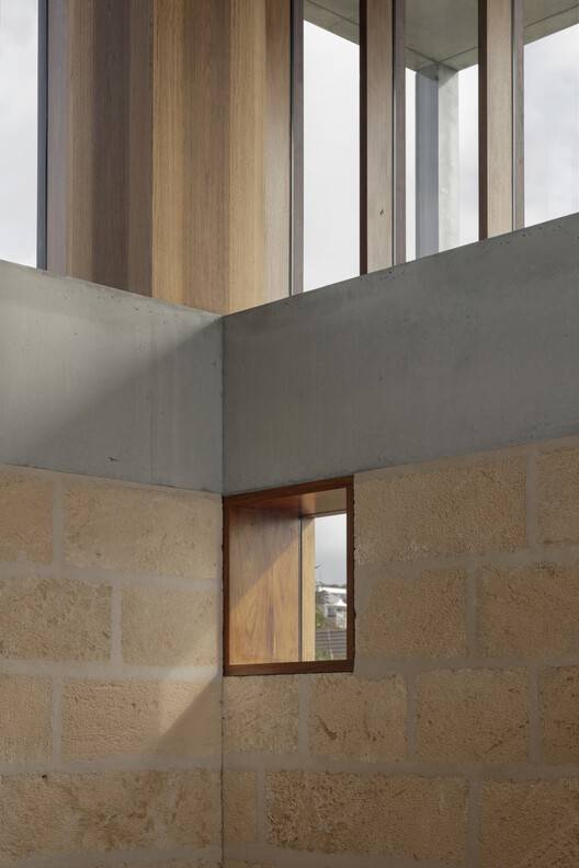 Text description provided by the architects. Quietly nestled in the foothills of southern Merewether, the New Castle manifests a subtle grandeur that is both ambitious and refined. Romantically envisioned as an invisible garden of paradise, the residence's design is entirely encompassed within a walled garden, creating a sub rosa sanctuary for its inhabitants. A thick limestone wall begins at one corner at hip height and rises to nearly two stories at the opposite corner, with only a few thoughtfully placed openings offering intriguing glimpses of what lies within, which include a cluster of Cabbage tree palms and a mature evergreen Magnolia Grandiflora.