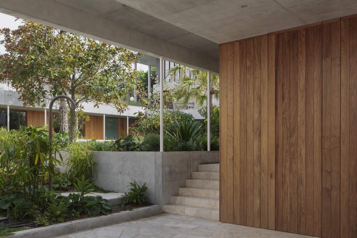 The varying levels throughout the home each cultivate a unique relationship with the garden. The ground floor, with its enveloping loggia and three-story courtyards, engages in a wet and shaded dialogue. The middle level, featuring an open-air promenade and pool, centres around the dryness and the canopy. Finally, the top level, dedicated solely to the master bedroom, offers an intimate connection with the sky and the horizon.