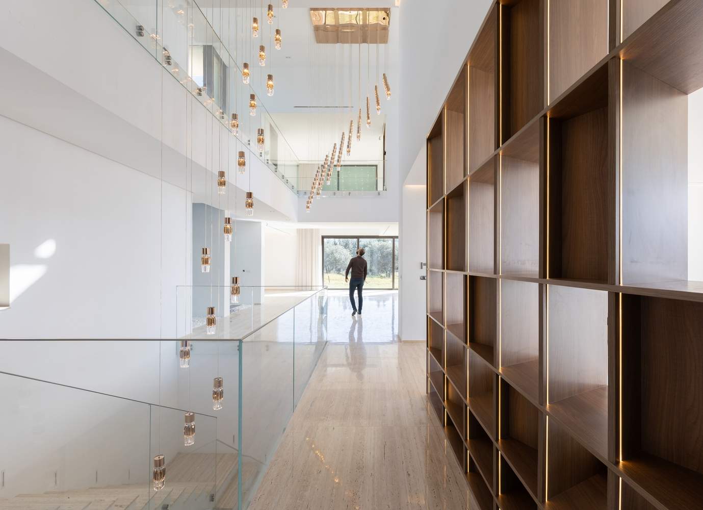 Materiality is approached with deliberate restraint. Pristine white volumes capture the shifting Mediterranean light, animating surfaces in a daily choreography of shadows. Travertine and timber introduce tactile warmth, while concrete elements — subtly tinted with sand pigments — ground the building in its context and enhance its material belonging. Internally, the spatial organization privileges continuity and flow. Circulations are not mere connectors, but choreographed transitions. Double-height volumes channel daylight deep into the core, while vertical pathways become elevated promenades offering ever-evolving perspectives of the surrounding landscape.