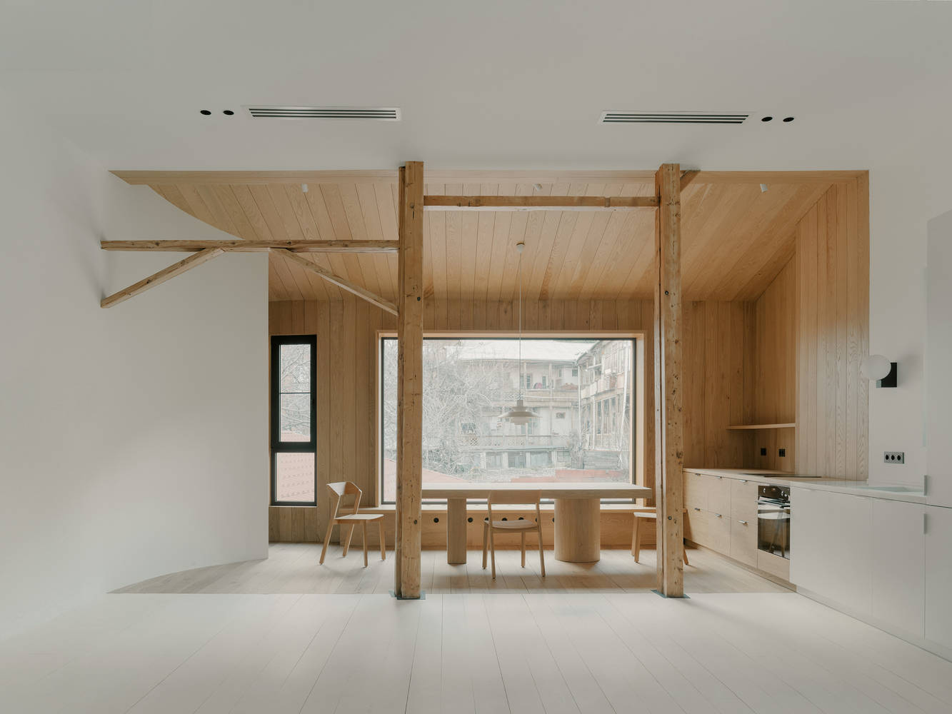 Text description provided by the architects. TIMM Architecture has transformed an old attic into a bright contemporary apartment, offering vistas of the historic town on one side and framing the majestic mountain on the other. The interior scenography is characterized by a pristine white palette, which guides visitors towards the focal point: a wooden-clad dining area that serves as a visual frame to the outside world.