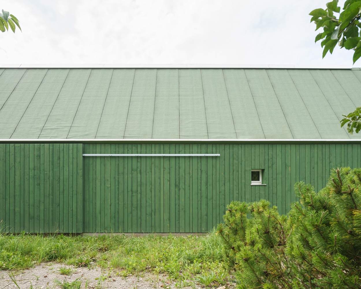 设计语言的创新与传统融合:工作室的设计在传统与现代之间取得了微妙的平衡。虽然从外观描述中难以得知具体设计细节,但绿色外立面和大型谷仓门的元素暗示了对当地传统建筑风格的借鉴与创新。大型谷仓门可能暗示了对工作室内部空间的灵活运用和开放性。这种设计手法融合了传统元素和现代设计理念,使得建筑既具有历史感,又充满了现代气息。建筑师可能通过材料的选择、色彩的运用,以及空间布局的巧思,将工作室打造成一个既能满足功能需求,又能反映当地文化特色的独特空间。