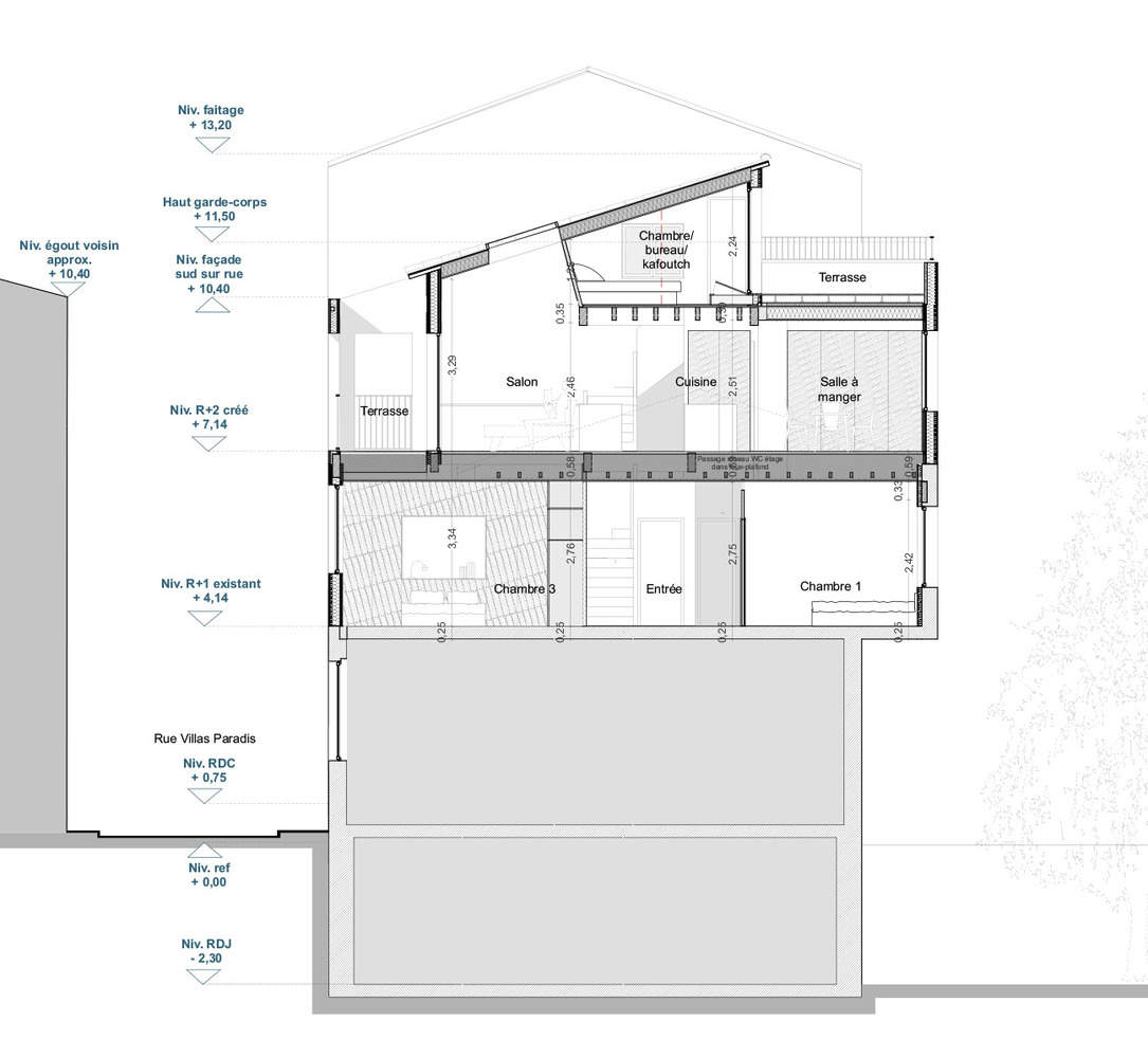 该项目涉及对一栋 20 世纪 50 年代已加高的联排别墅进行修复与再次加高。该别墅位于街区中心,具有悬挑部分,且街道一侧设有退缩空间,这符合当地城市规划(PLU)的发展变化。遵循现行城市规划规定,加高部分扩展了庭院一侧的布局,并恢复了街道一侧的建筑序列。