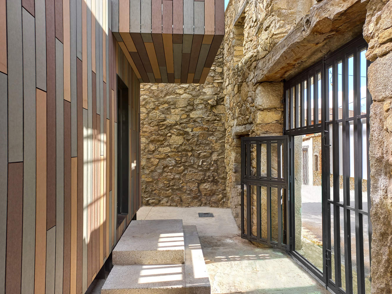 模块化与空间对话的精妙:项目巧妙地利用了海运集装箱作为模块,考虑到当地交通的实际情况,实现了高效的运输和建造。这种模块化设计不仅加快了施工速度,也为建筑赋予了独特的现代感。更重要的是,建筑师通过在原有石砌建筑屋顶引入模块的方式,创造了一个令人兴奋的过渡空间,例如庭院。这种空间策略使得新旧建筑相互对话,在保护原有建筑风貌的同时,为现代生活提供了新的可能性。这种设计手法,既是对历史的尊重,也是对现代建筑的创新,完美地平衡了新与旧、实用与美学的关系。