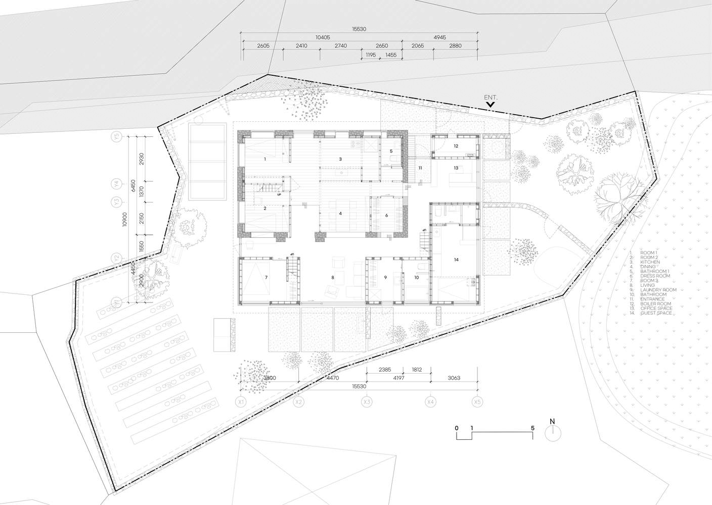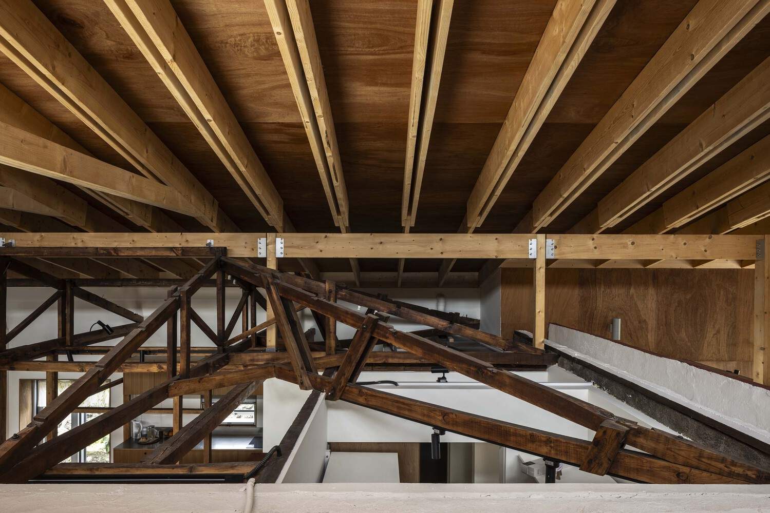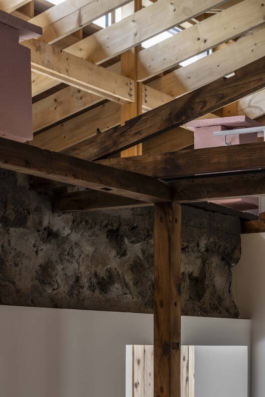 设计策略是保留现有建筑,并在其上覆盖一个新的结构,将旧建筑和扩建部分整合到一个单一的屋顶下。 这种方法减少了建筑面积,提高了结构效率,增强了空间连续性。 柱子的节奏、石墙的重量和窗户的位置 —— 这些现有建筑空间秩序的元素成为塑造新计划的关键参考。