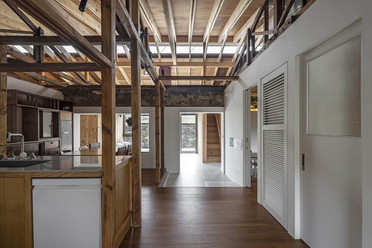 On the east side, office and guest spaces have been added, and an entrance has been set up between them to separate different projects. This entrance extends inward like a small alley, naturally connecting the existing space and the new space, and forming a loop throughout the entire house. Entering the interior, the old stone walls, chimneys, and eaves - once external elements - remain intact. These past fragments not only add physical traces, but also add a certain thickness of time and space to the new structure.