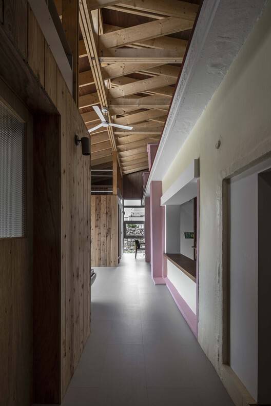 Due to the existing building being located on the north side of the site, the expansion will naturally proceed southward. In order to solve the lighting problem caused by the deepening of the floor plan, the gable roof is intentionally offset, allowing light to penetrate into the interior through gaps.
