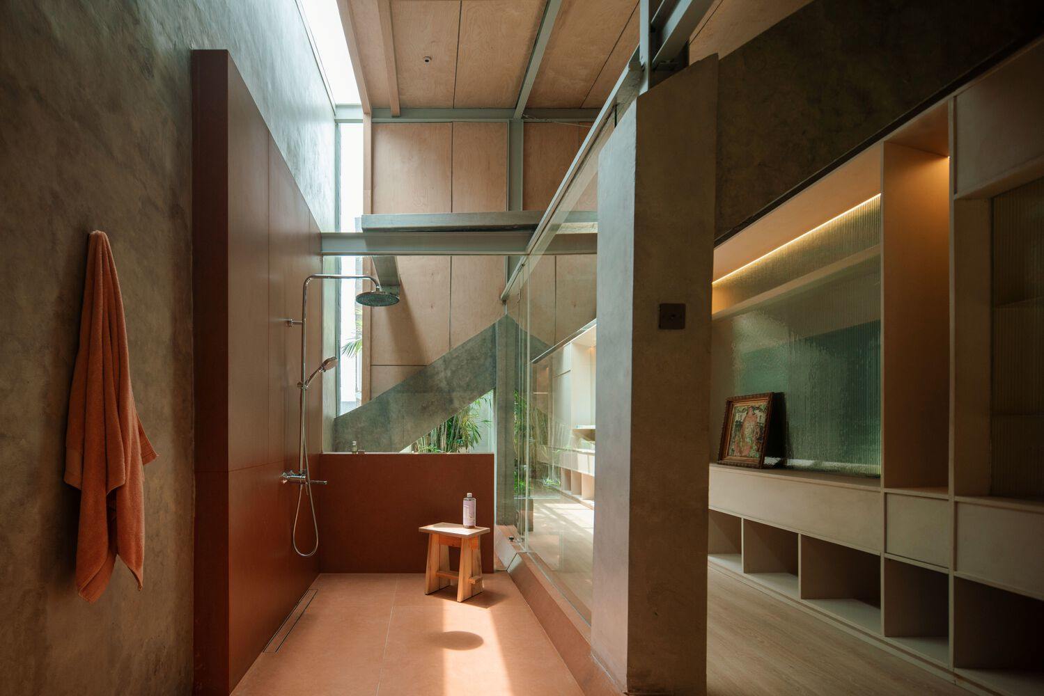 The design team used more traditional materials throughout the entire area, except for the stainless steel food storage room area. The attic features a consistent light brown color scheme that harmonizes with the natural colors of the surrounding landscape, which runs through each floor. The two staircases connecting each floor are cleverly integrated, with the only difference being the darker color and porous texture. The rest of the house adopts lighter colors and smooth surfaces, while the bathroom presents surprisingly strong colors.