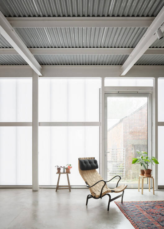 The two buildings that make up The Old Byre are intentionally kept unconnected. Daily life intertwines and interacts through corridors between private and social spaces, accompanied by the coolness of the morning, rain, and the heat of summer. At night, the exterior facade is translucent, faintly revealing indoor activities. In the older barn section, a "house within a house" made of spruce plywood was constructed, with a back alley connecting the more private interior spaces it accommodates, which are adjusted and modified through full height doors without traditional handles or locks.
