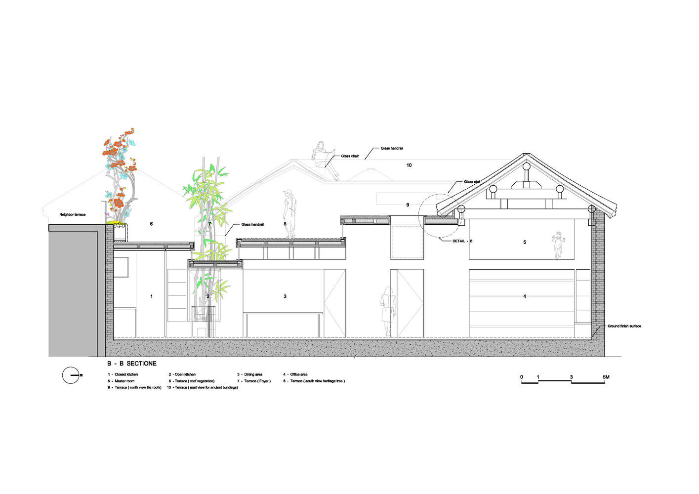 场地中传统建筑是北房,结构质量较好,应予以保留做适当改造。而长条形南方是仿古建筑施工方法,新搭建的木结构房子,除基础墙体外,其余部分可考虑拆除。在实地勘察中发现,地块正南方约 32 米的大杂院内有一棵保护古树,树高约21米。这棵古树成为了空间中的一大亮点。众所周知,北京传统四合院和大杂院的设计中,庭院是其核心魅力所在。如在没有庭院的情况下可以直接观赏到这棵古树。而本次设计通过屋顶高差,反复推敲和研究,将“借景”的概念引入改造方案中,以解决光线和庭院感的问题。传统的青砖、筒瓦、木结构,与古树和竹子的自然元素,共同体现出“时间的痕迹”,通过分层次的融合,赋予新空间更深的文化韵味和时代意义。