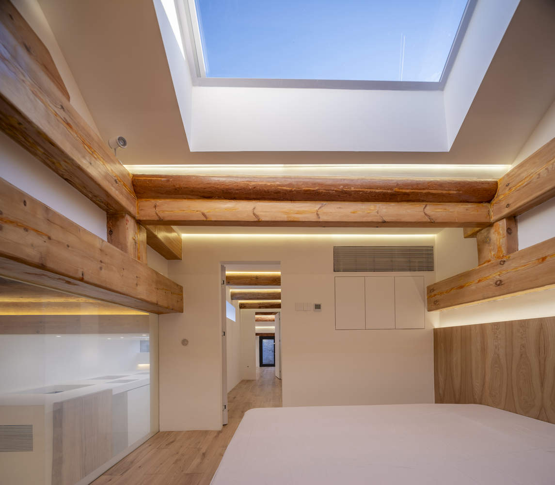 整个空间设计中,简化了家具,仅保留床、椅等必要元素,同时通过优化收纳空间满足实际需求。在此基础上,充分利用自然光的穿插、直射,折射与漫射效果,将季节变化中的光影与传统青砖、筒瓦、木结构的“时间痕迹”相融合,打造出兼具功能性与文化底蕴的现代居住空间。