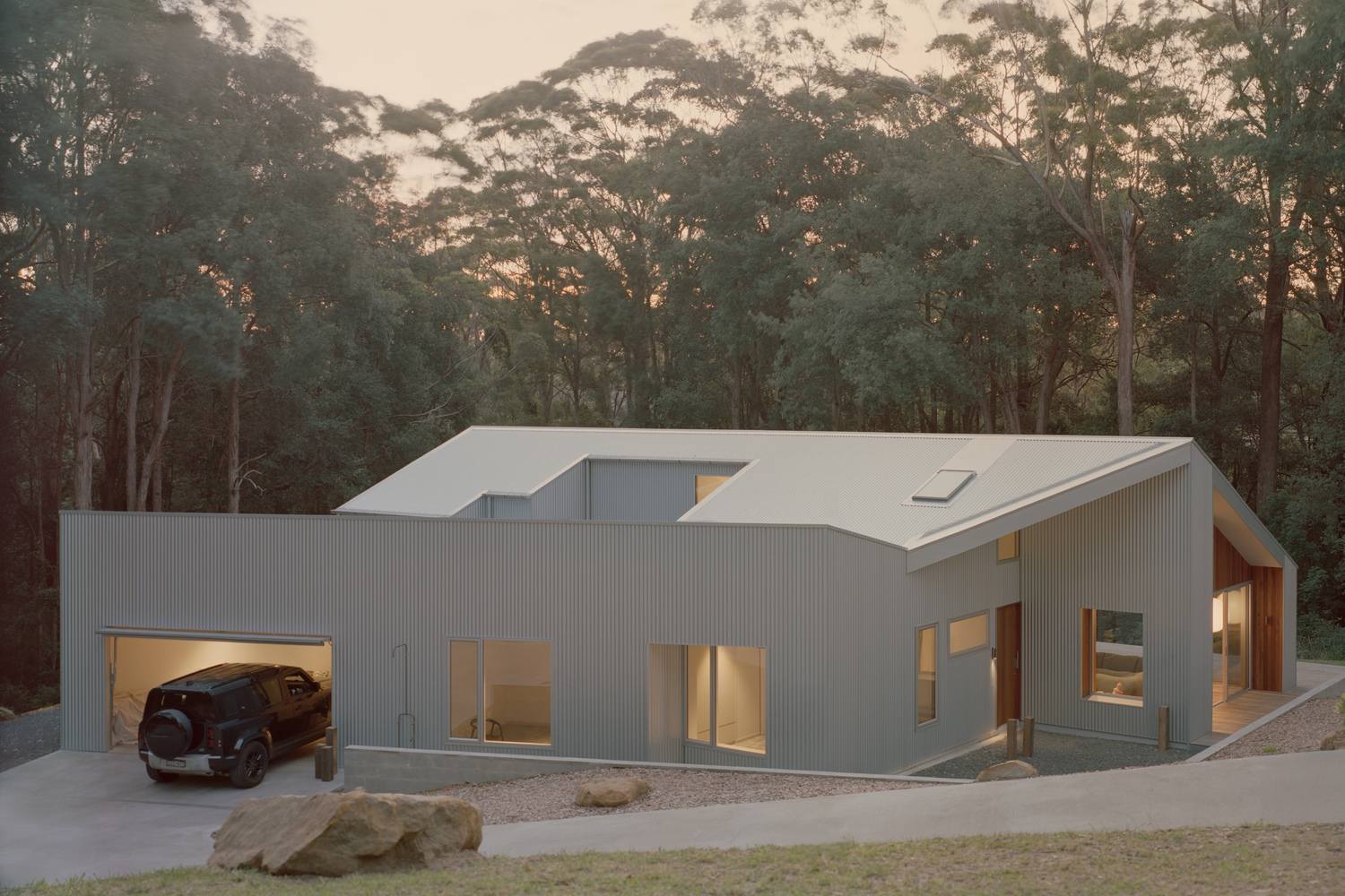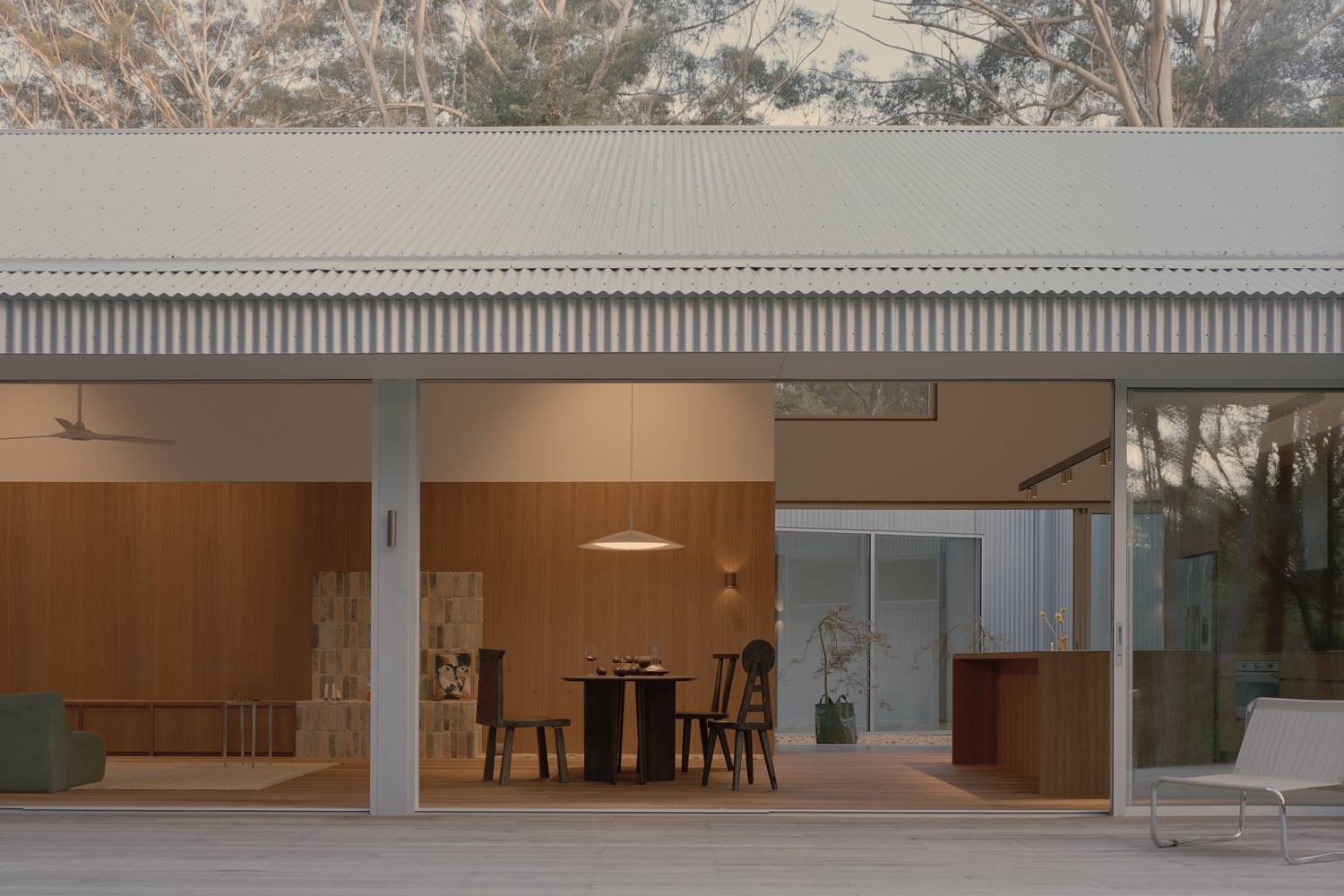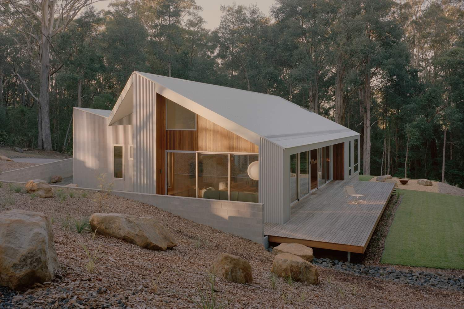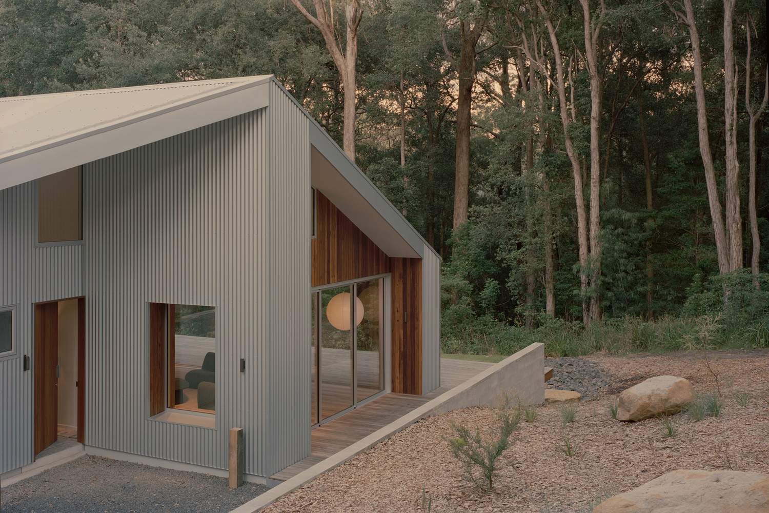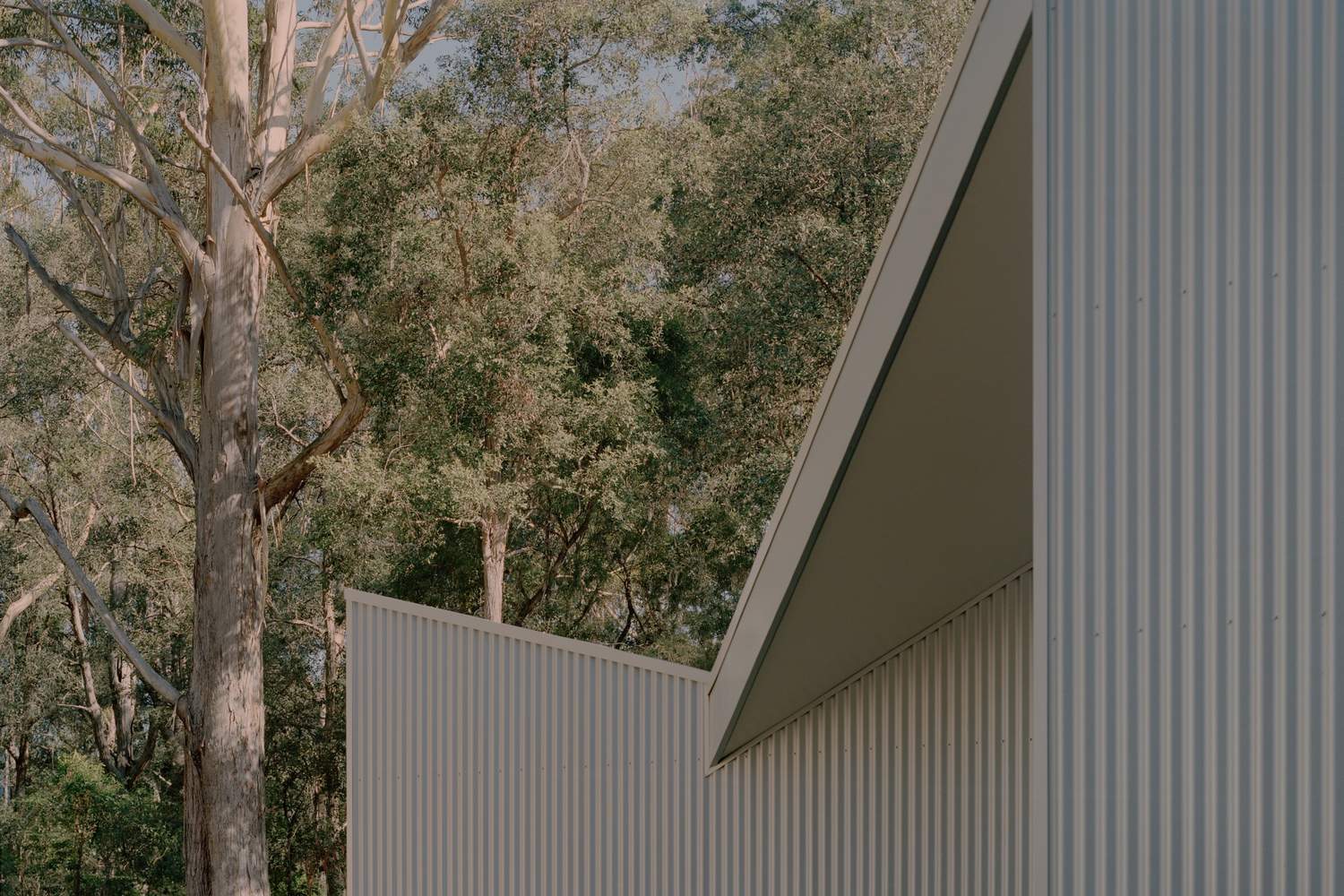 该建筑外立面采用了波纹锌铝镁合金板材(Zincalume),这种材料因其耐用性以及能以微妙方式捕捉不断变幻的海岸光线而被选用。本地取材的斑纹桉木(Spotted gum)和砂岩(其中砂岩直接从场地现场开采)为建筑增添了温暖质感、触觉体验以及一种扎根于此的稳固感。选用这些材料不仅是因为它们的性能表现,还考虑到它们随时间推移将如何经受自然作用并产生变化。