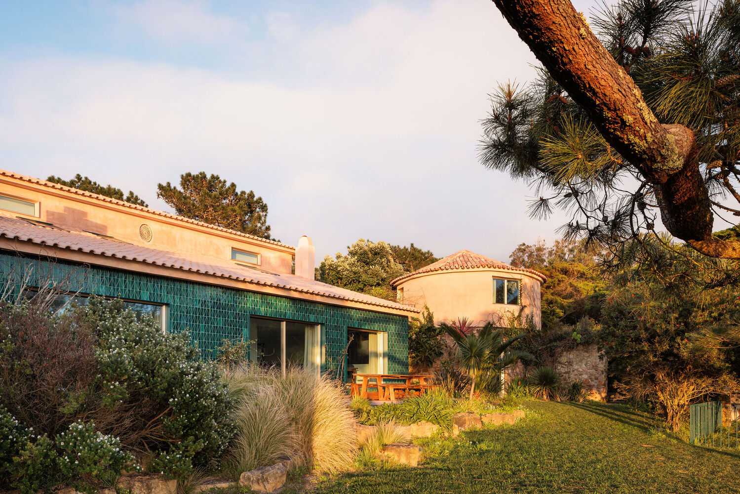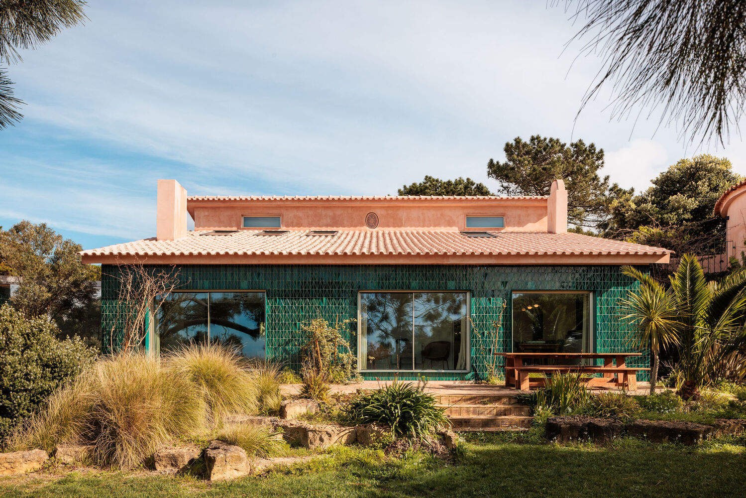 在一楼建筑立面的处理上,包覆材料选用了由艺术家兼陶艺家 MAVC 设计的手工打造的二维与三维瓷砖。三维元素的节奏性运用,让人联想到海洋的涌动,而蓝绿色的水色调则与周边的植被和大海形成了色彩上的连贯性。同样的设计理念也被应用到了泳池区域,在这里,建筑仿佛融入了场地的材质之中,浑然一体。屋顶和上层立面则采用了开普敦石颜色的有色石灰进行包覆,进一步强化了房屋与地面、建筑与自然之间的构造连贯性。