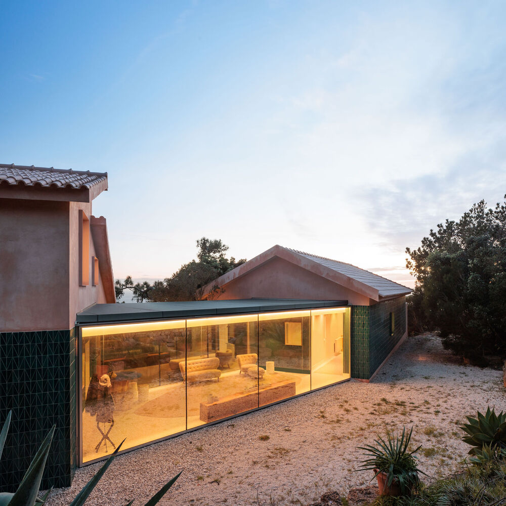 室内选用了精致考究的珍贵材料,其中,罕见且极具表现力的马卡乌巴斯蓝(Macaúbas Blue)大理石成为整个项目的核心元素。曾经的多功能室被重新定义,从开普敦石中提取的粉色色调赋予其全新的质感,与定制设计的木工制品和液压马赛克在微妙的纹理和谐中相互呼应。整个项目基于“不张扬的建筑”这一理念,每个决策都致力于探寻本质:材料、光线以及与场地的关系。这是一种旨在保持静谧却又不失严谨的建筑风格;它隐退自身,以凸显海洋、天空与悬崖的存在。在这里,房屋并不刻意彰显自我,而是静静地伫立,与周围环境融为一体。