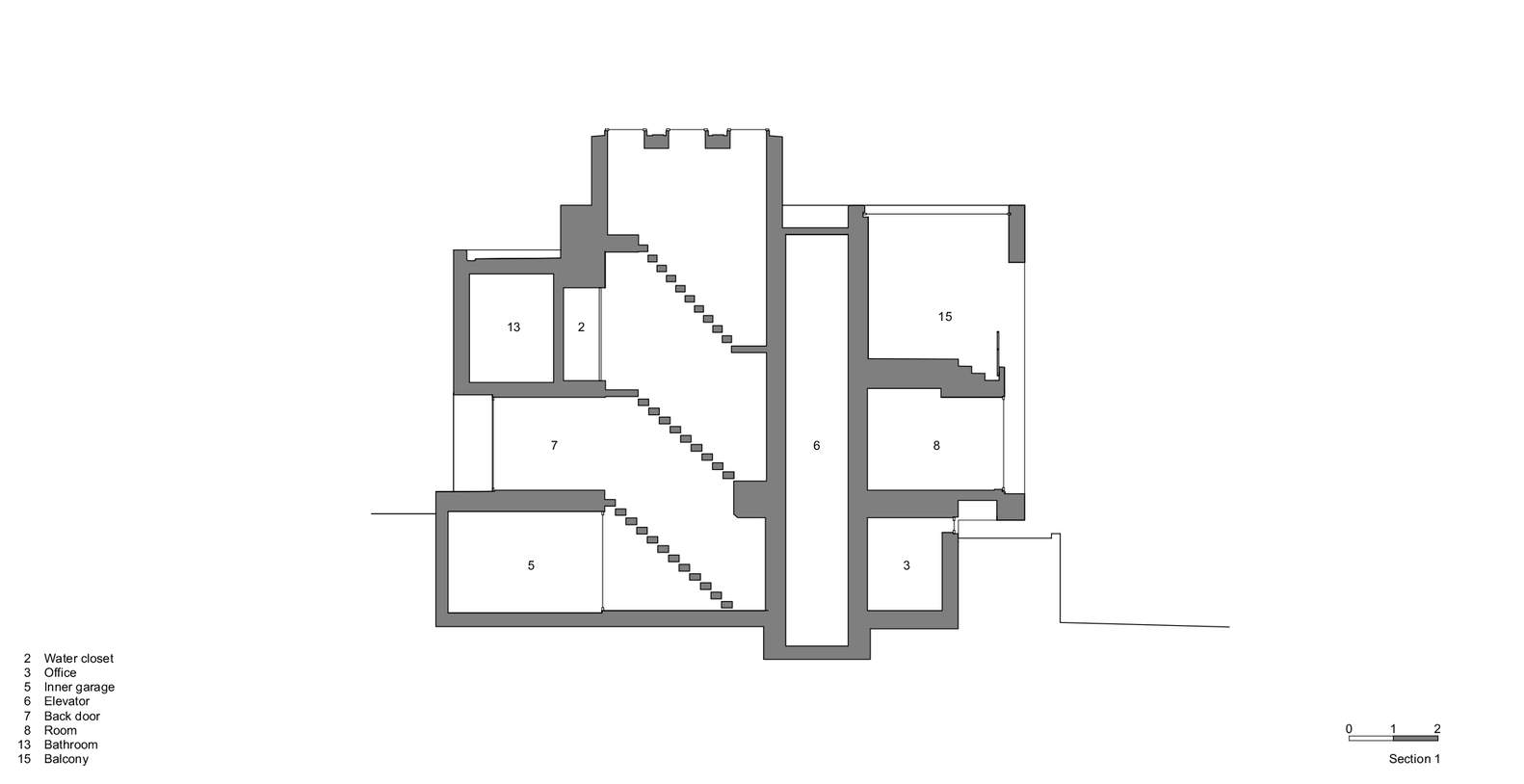其中有两间私人房间的窗户朝向街道和树木,另外两间私人房间的窗户则面向混凝土管筒与私人房间墙壁之间的夹层空间,从那里可以看到裸露的混凝土墙面。该地块的地面层比街道水平面高出约 2 米。在此项目中,我们拆除了部分现有的挡土墙,以便在地平面以下打造一个可停放两辆车的车库和一个办公室。