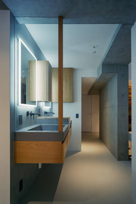 Two private rooms have windows facing the street and trees, while the windows of the other two private rooms face the mezzanine space between the concrete pipe and the walls of the private rooms, from which the exposed concrete walls can be seen. The ground level of the plot is about 2 meters higher than the street level. In this project, we demolished some of the existing retaining walls to create a two car garage and an office below ground level.