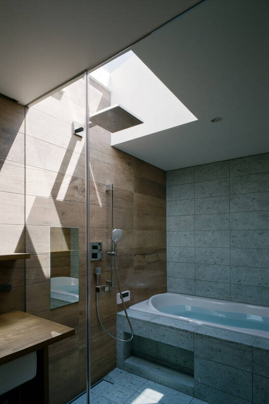 空间序列的巧妙布局: 项目的空间布局体现了对光线、通风和景观的深刻理解。二层LDK区域与外部景观的无缝连接,创造了一个开放、通透的生活空间,而夹层空间的设置,则为室内带来了充足的光线和空气流通,更丰富了空间层次。这种内外空间的渗透和融合,使得居住者能够充分地欣赏到外部的自然景观,同时又保证了室内的私密性。地下车库和办公室的设计,是对地块的充分利用,也增强了建筑的功能性。整个设计通过对不同空间尺度的巧妙组合,营造出一种引人入胜的空间序列,既满足了居住需求,又实现了对环境的尊重,充分体现了建筑师的精湛技艺。