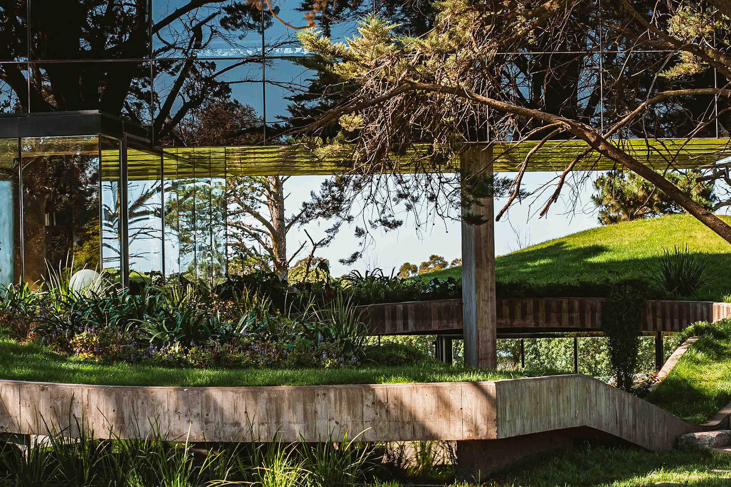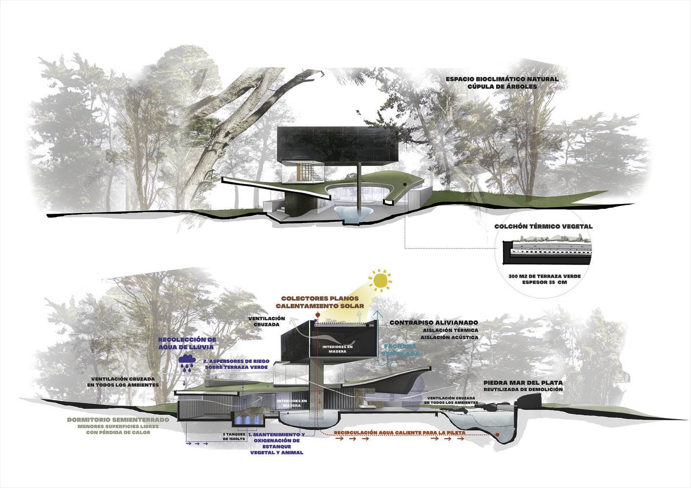 在覆盖层之上,一个绿色露台为下层空间提供了保护,恢复了被占用的地表面积,并将其转化为一个自然空间。