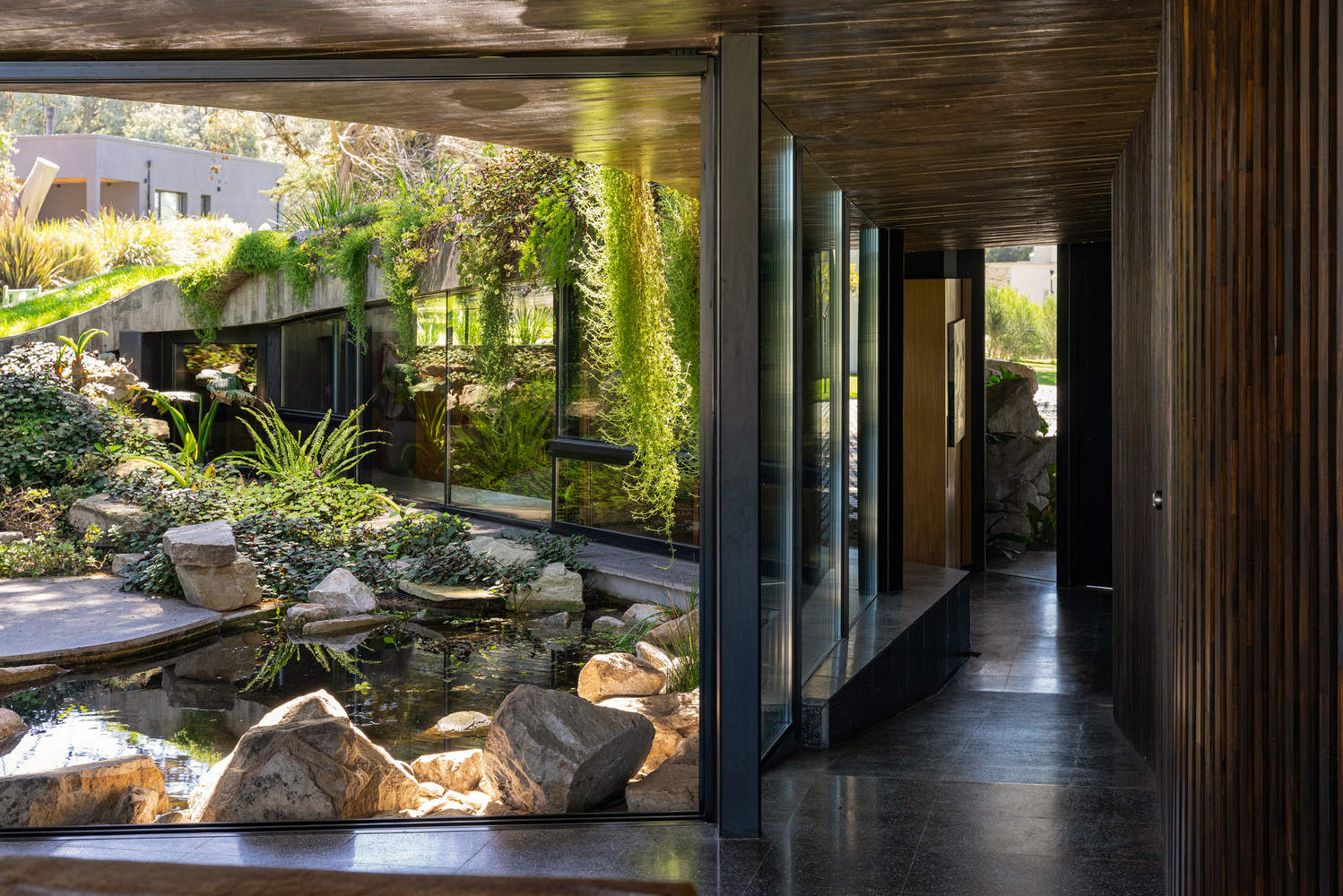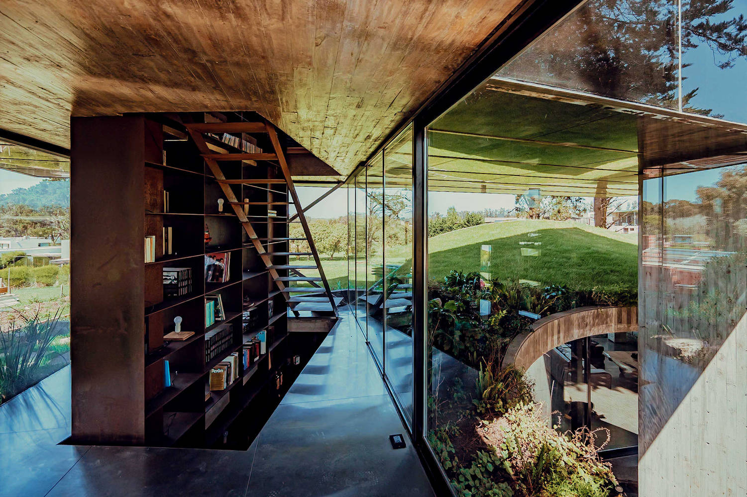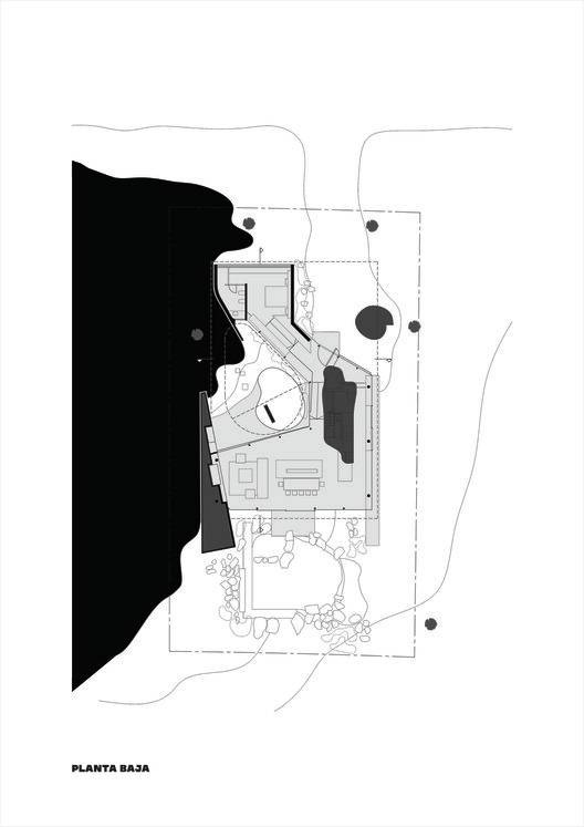 在混凝土覆盖层之下,打造了一个开放式空间,其核心是一个中央庭院,作为住宅的心脏地带,巧妙地避开了街道的视线。庭院之外,一个流动的木质体量被策略性地安置在覆盖层下方,通过其与边缘的关系来界定并组织所有功能区域。它巧妙地将公共区域与私密区域分隔开来,同时也服务于服务空间。